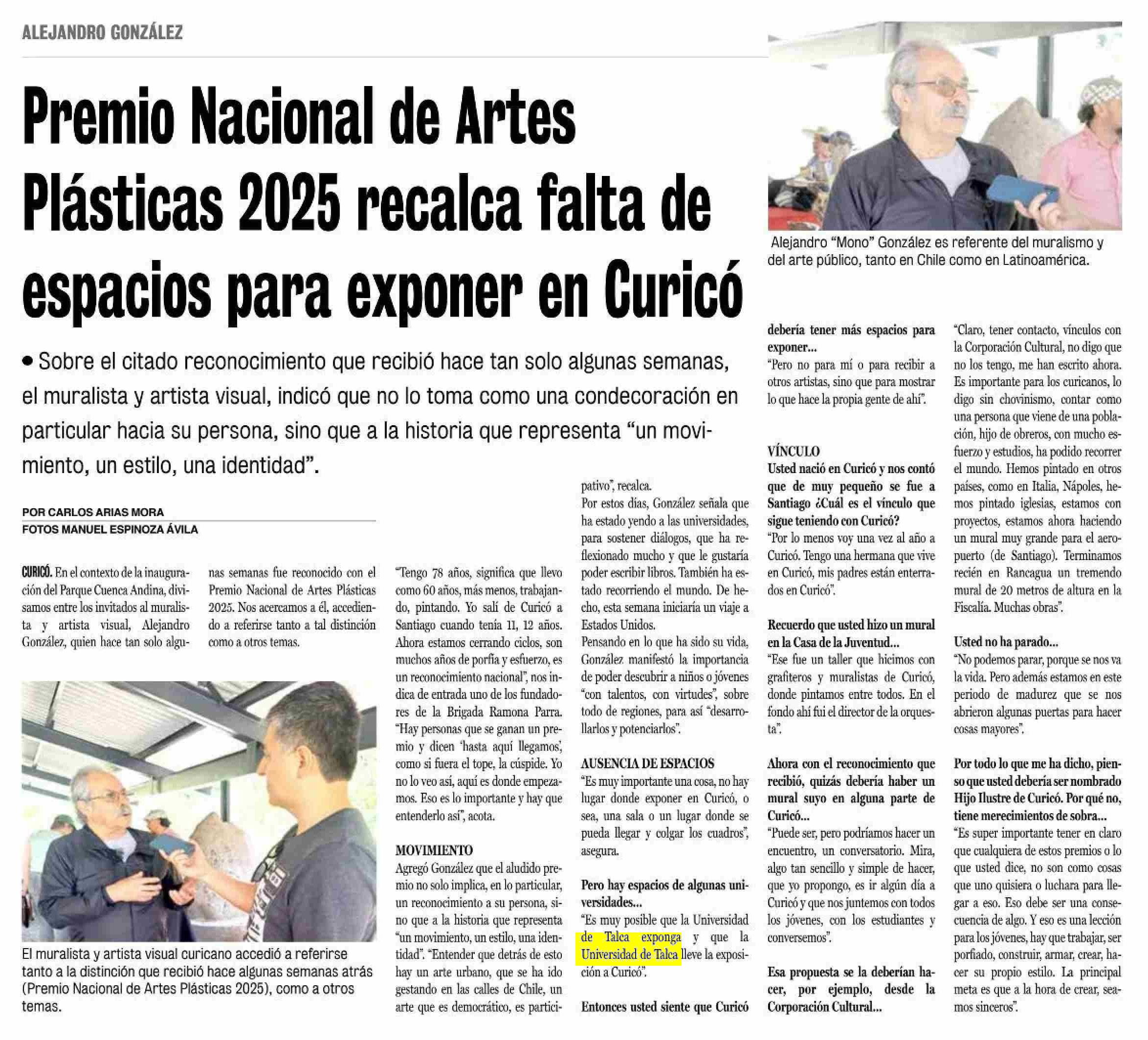 Premio Nacional de Artes Plásticas 2025 recalca falta de espacios para exponer en Curicó. Se menciona la Universidad de Talca.