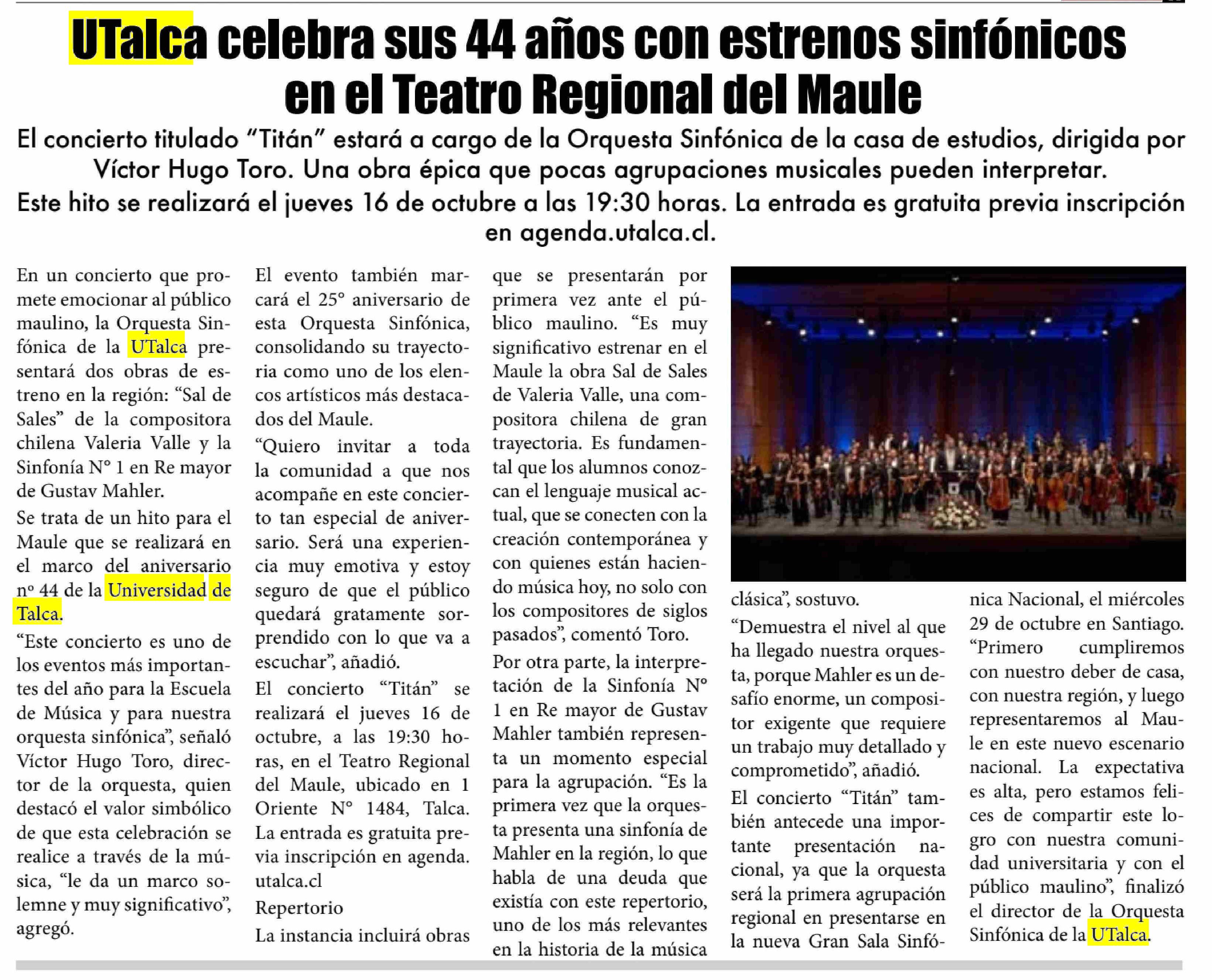 UTalca celebra sus 44 años con estrenos sinfónicos en el Teatro Regional del Maule. Se refiere Víctor Hugo Toro, director de la Orquesta Sinfónica