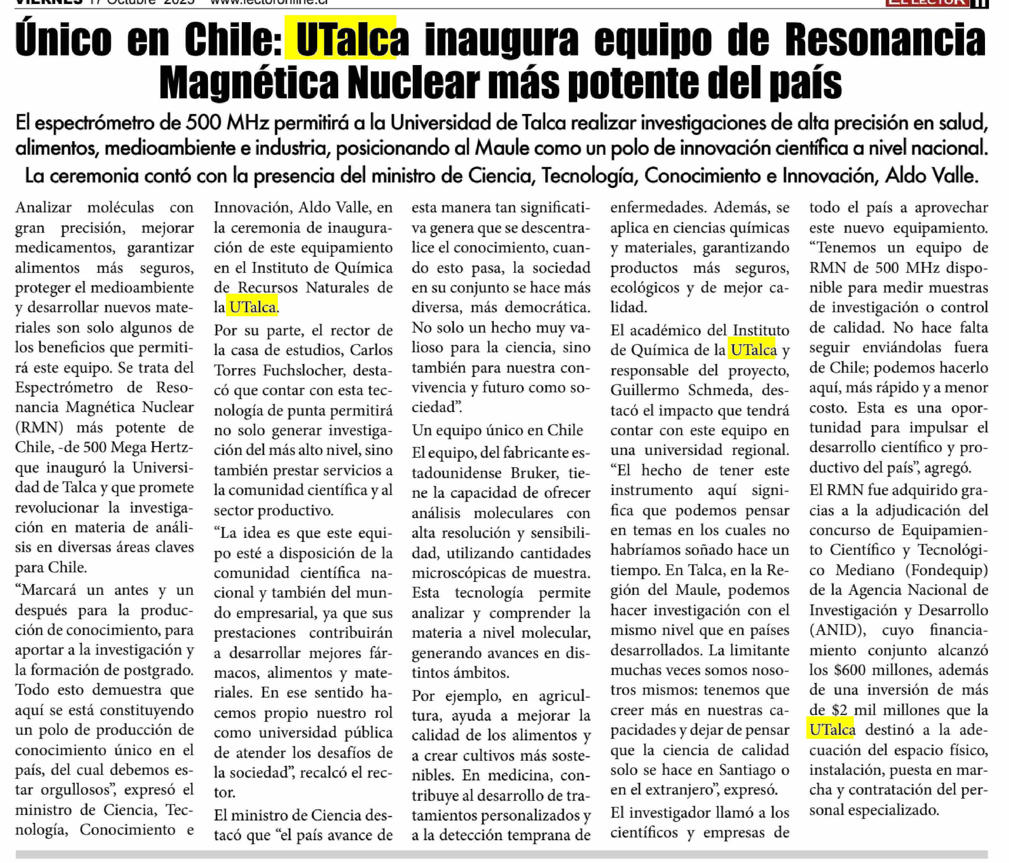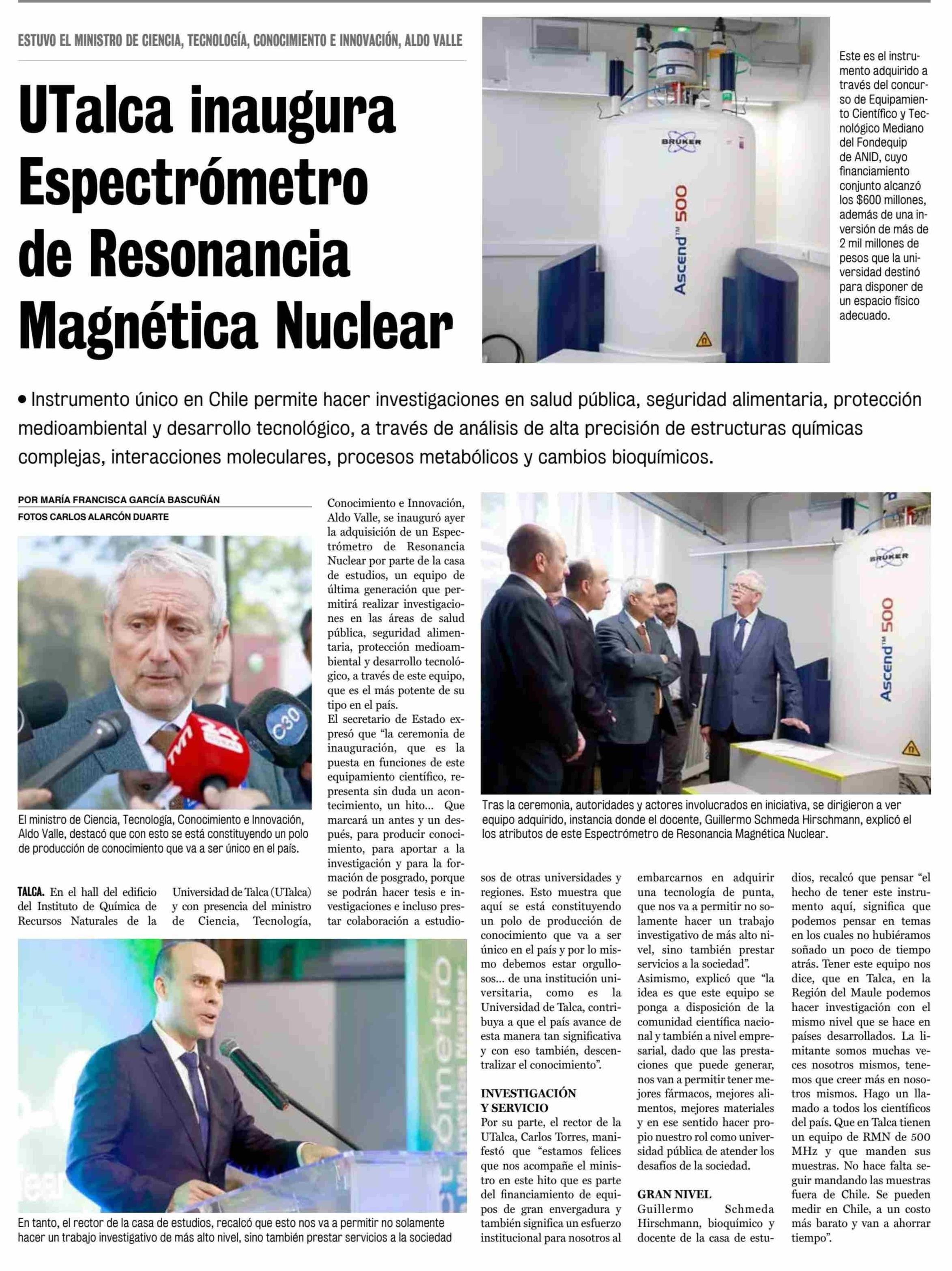 UTalca inaugura Espectrómetro de Resonancia Magnética Nuclear. Se refiere Carlos Torres Fuchslocher, rector y Guillermo Schmeda, académico del Instituto de Química.