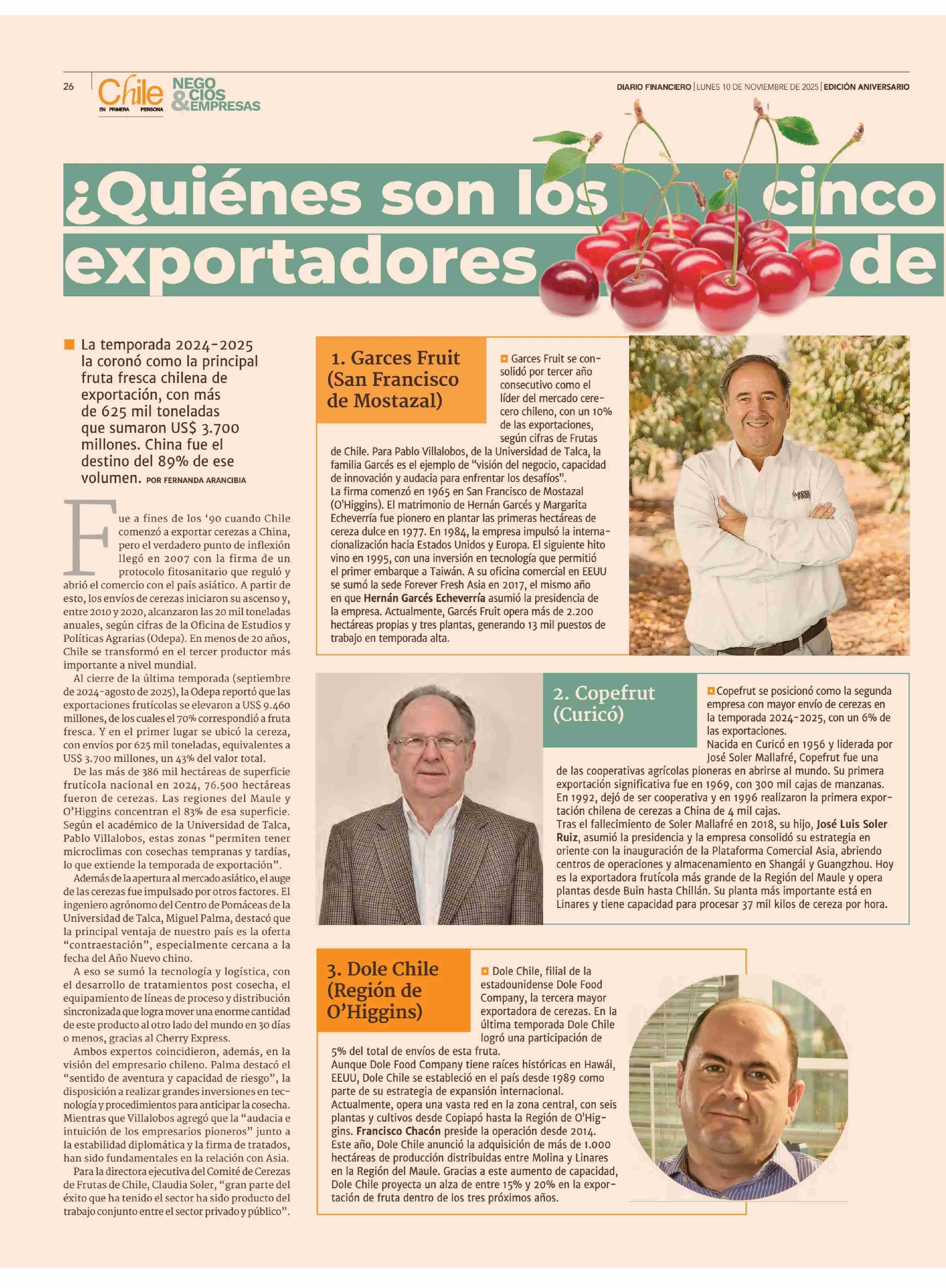 ¿Quiénes son los cinco mayores exportadores de cerezas? Se refiere Pablo Villalobos Mateluna, académico del Departamento de Economía Agraria.