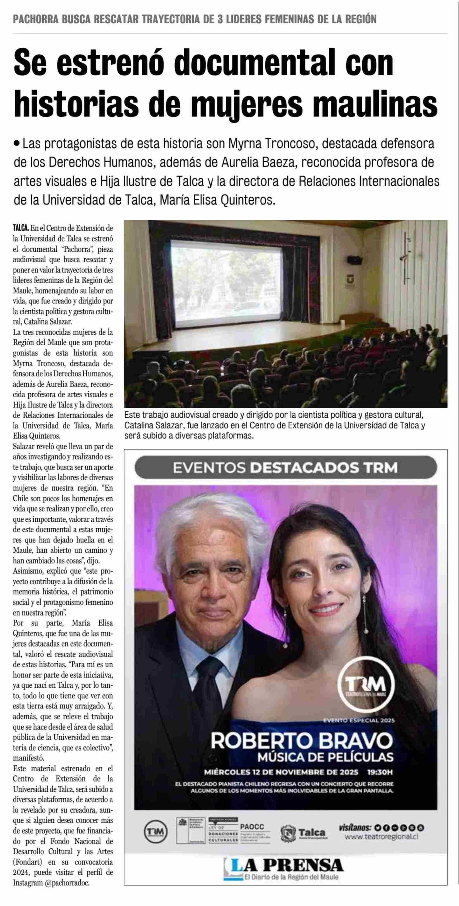 Estrenan documental con historias de destacadas mujeres maulinas. Se refiere María Elisa Quinteros, directora de Relaciones Internacionales.