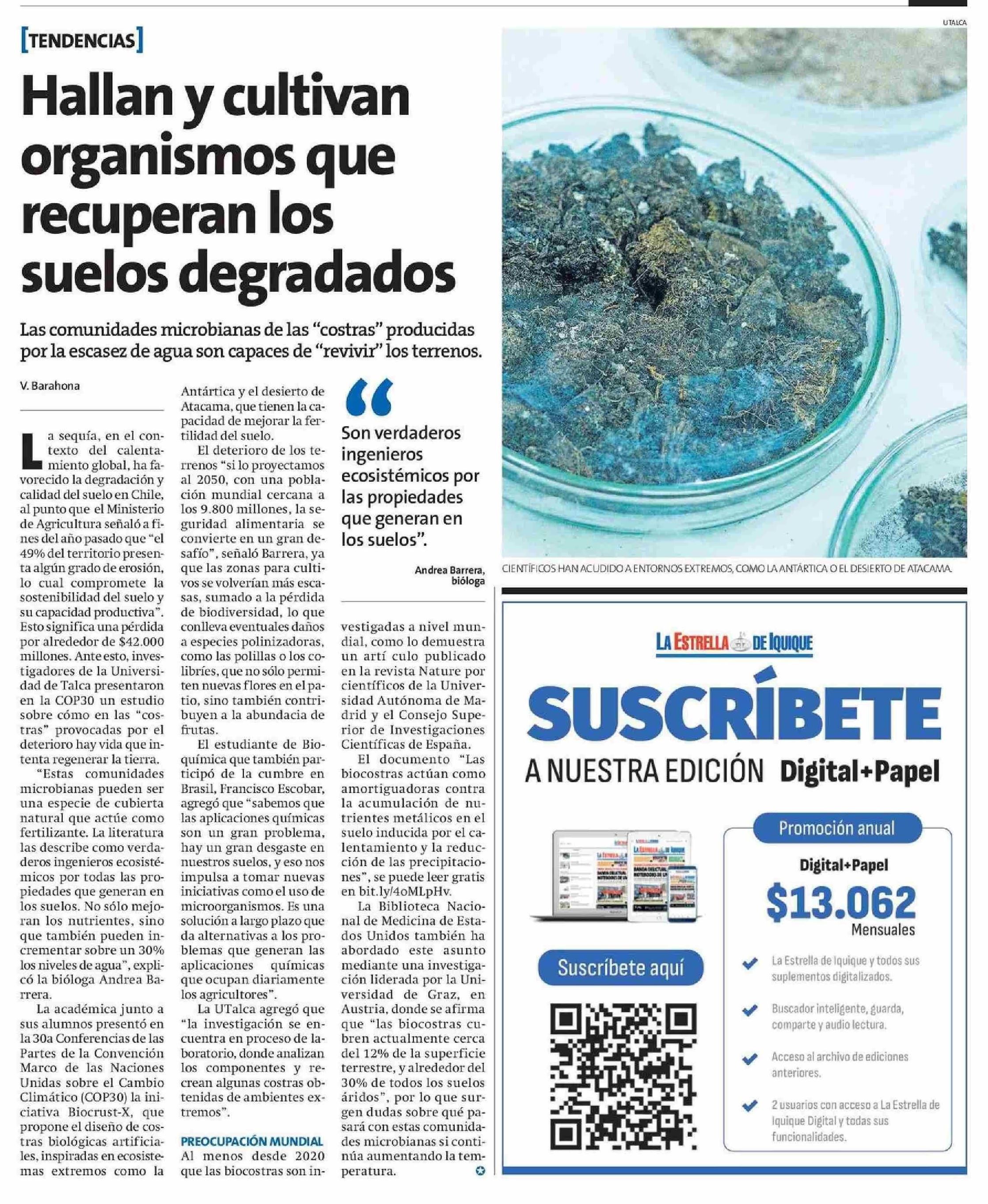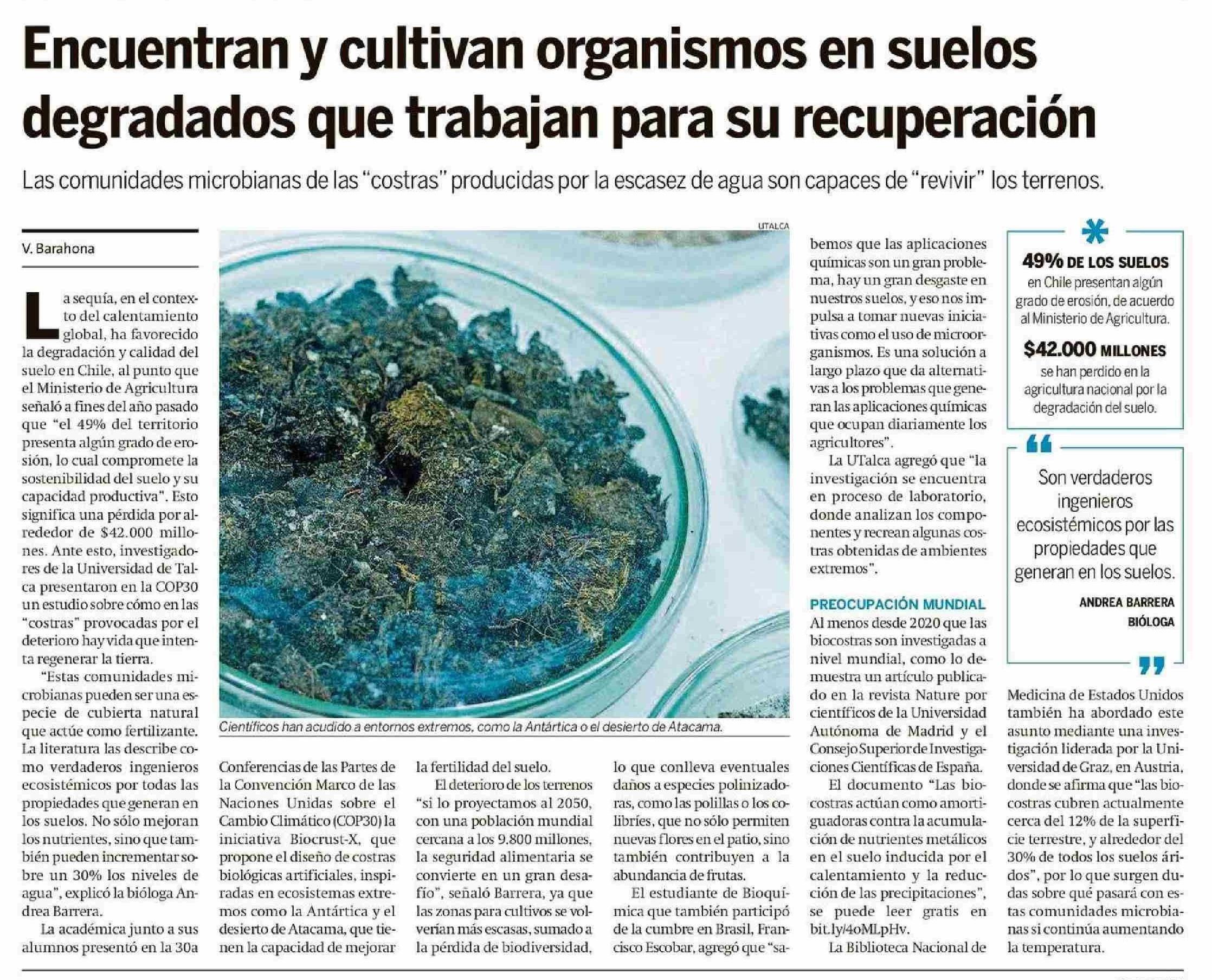 Hallan y cultivan organismos que recuperan los suelos degradados. Se refiere Andrea Barrera Valenzuela, académica de la Facultad de Ciencias de la Salud.
