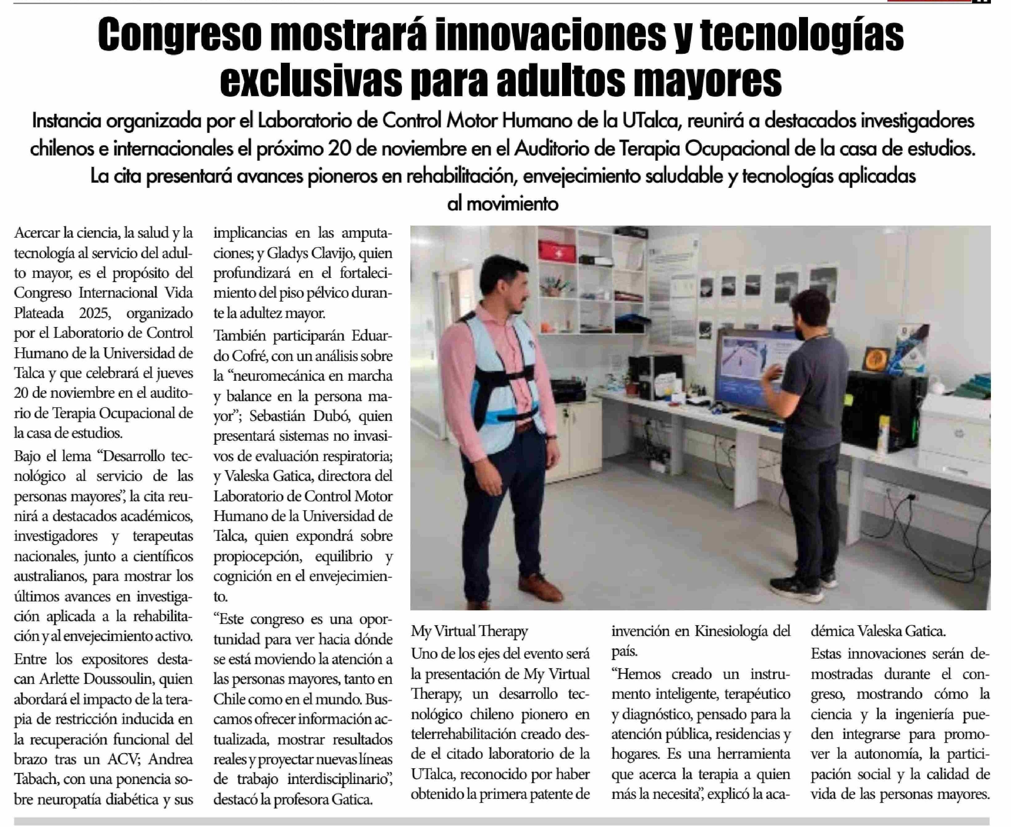 Congreso mostrará innovaciones y tecnologías exclusivas para adultos mayores. Se refiere Valeska Gatica, directora del Laboratorio de Control Motor Humano.