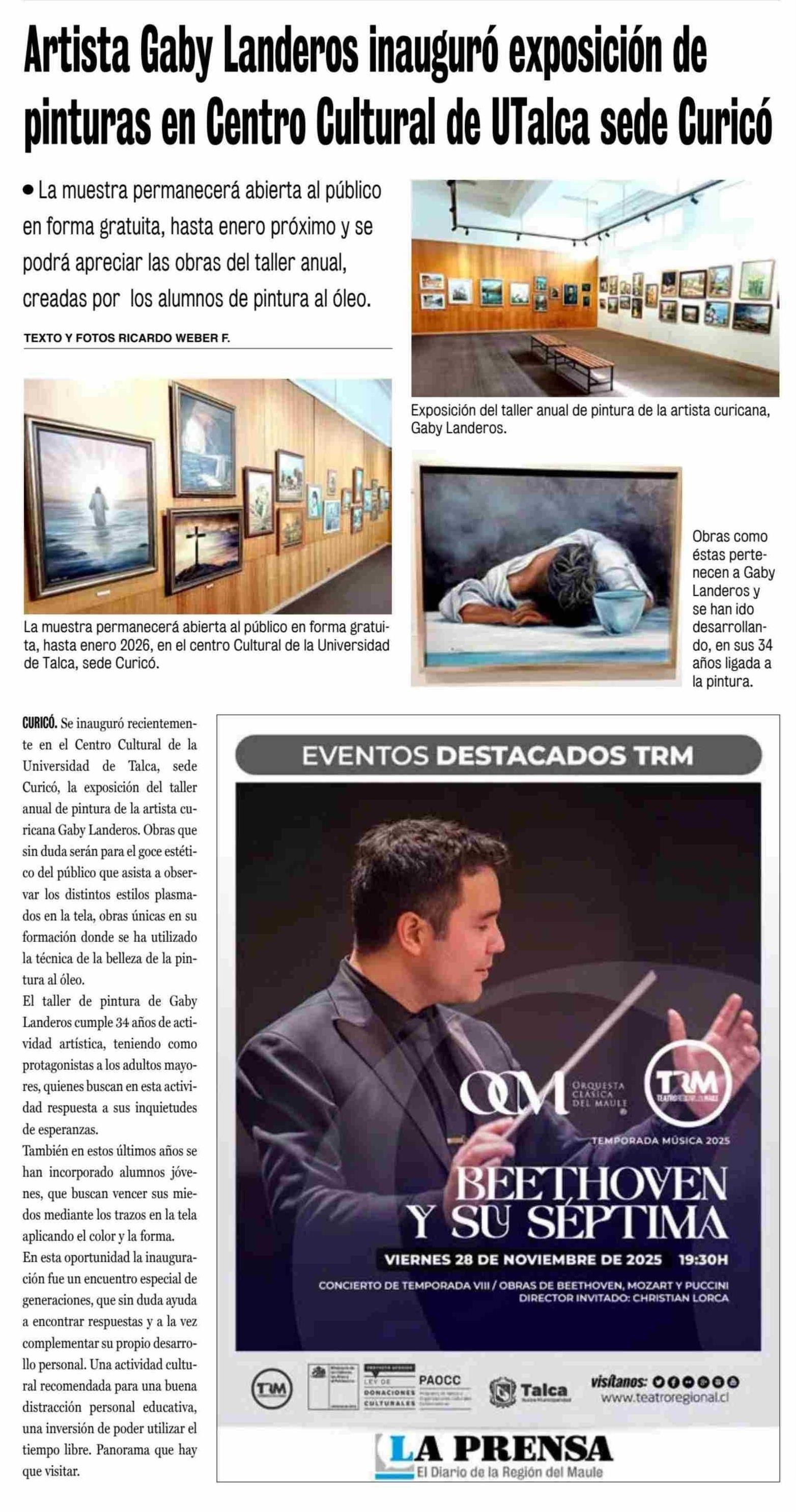 Artista Gaby Landeros inauguró exposición de pinturas en Centro Cultural de UTalca sede Curicó. Se menciona la Universidad de Talca.