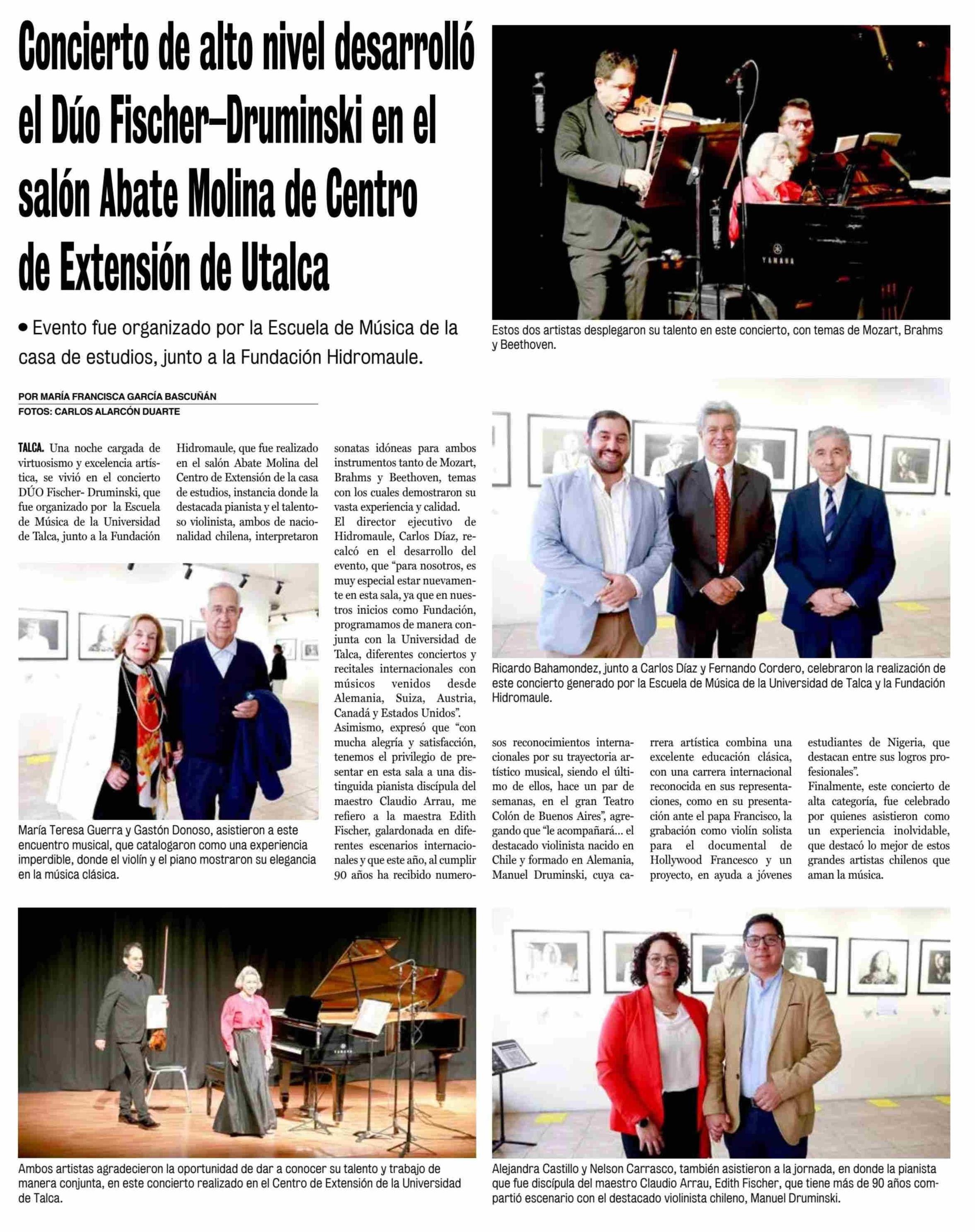Concierto de alto nivel desarrolló el Dúo Fischer-Druminski en el salón Abate Molina de Centro de Extensión de Utalca. Se menciona la Universidad de Talca.