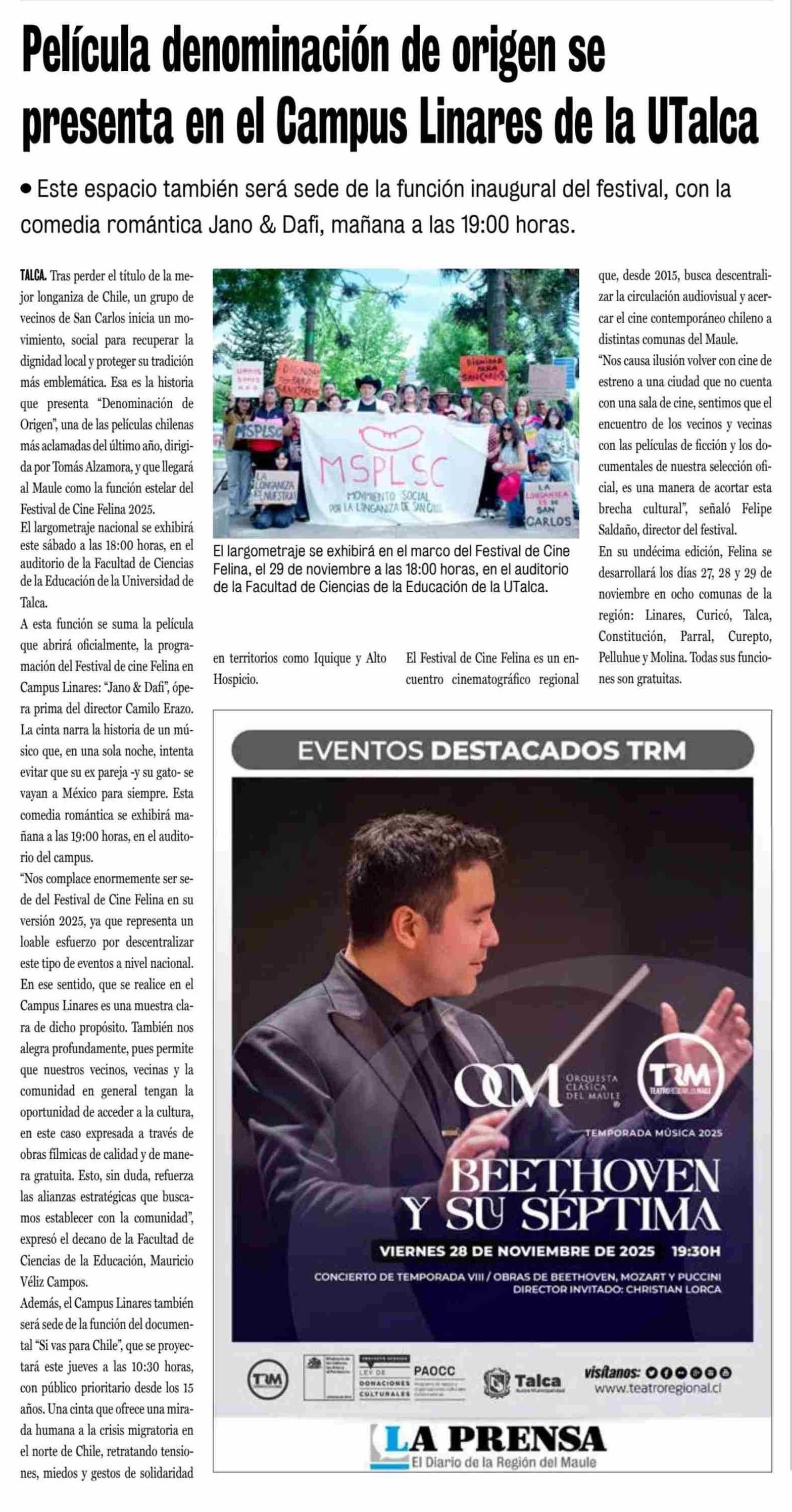 Estrenos nacionales gratis en la UTalca: Película “Denominación de Origen” lidera el Festival Felina 2025. Se menciona la Universidad de Talca.