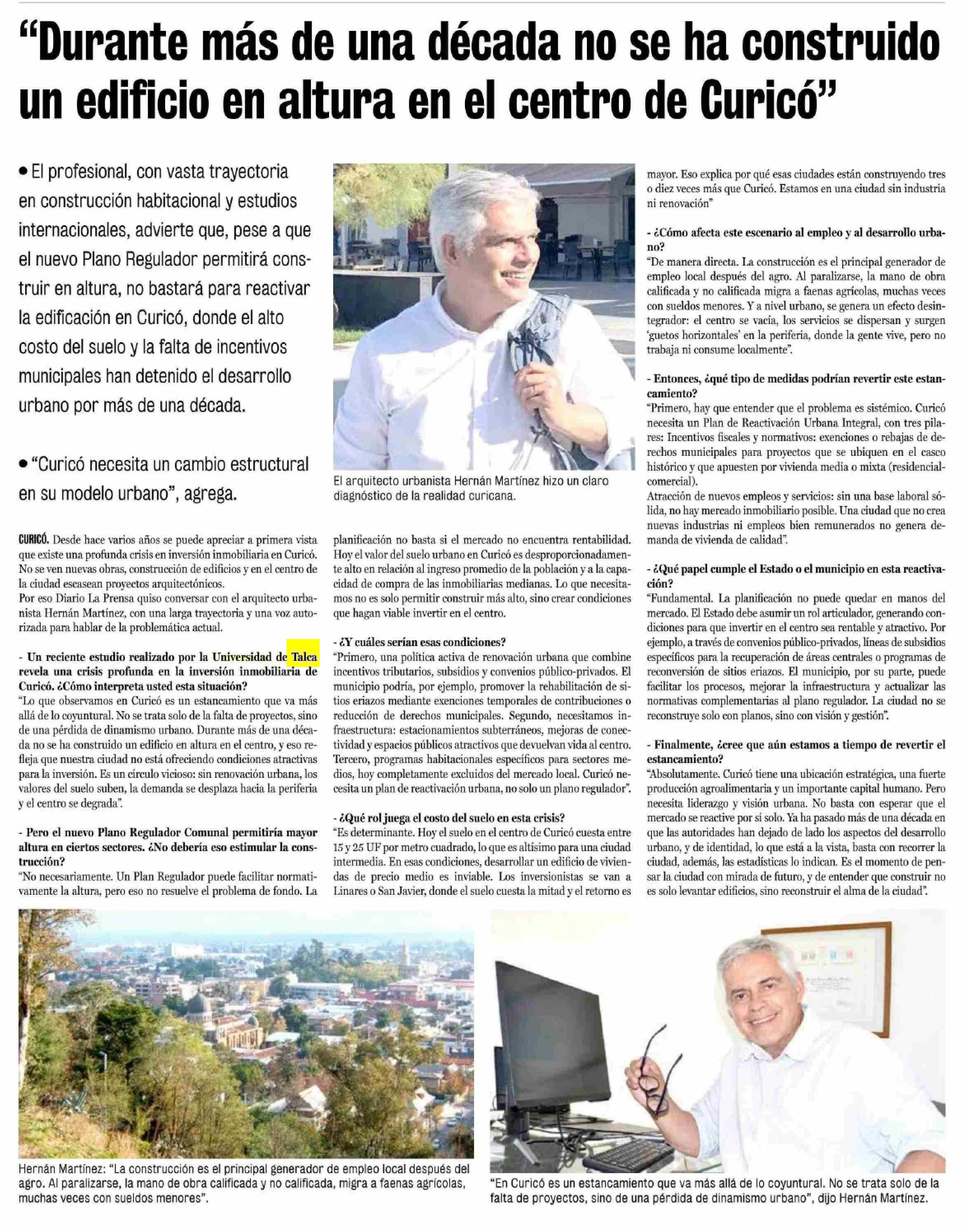 “Durante más de una década no se ha construido un edificio en altura en el centro de Curicó”. Se menciona la Universidad de Talca.