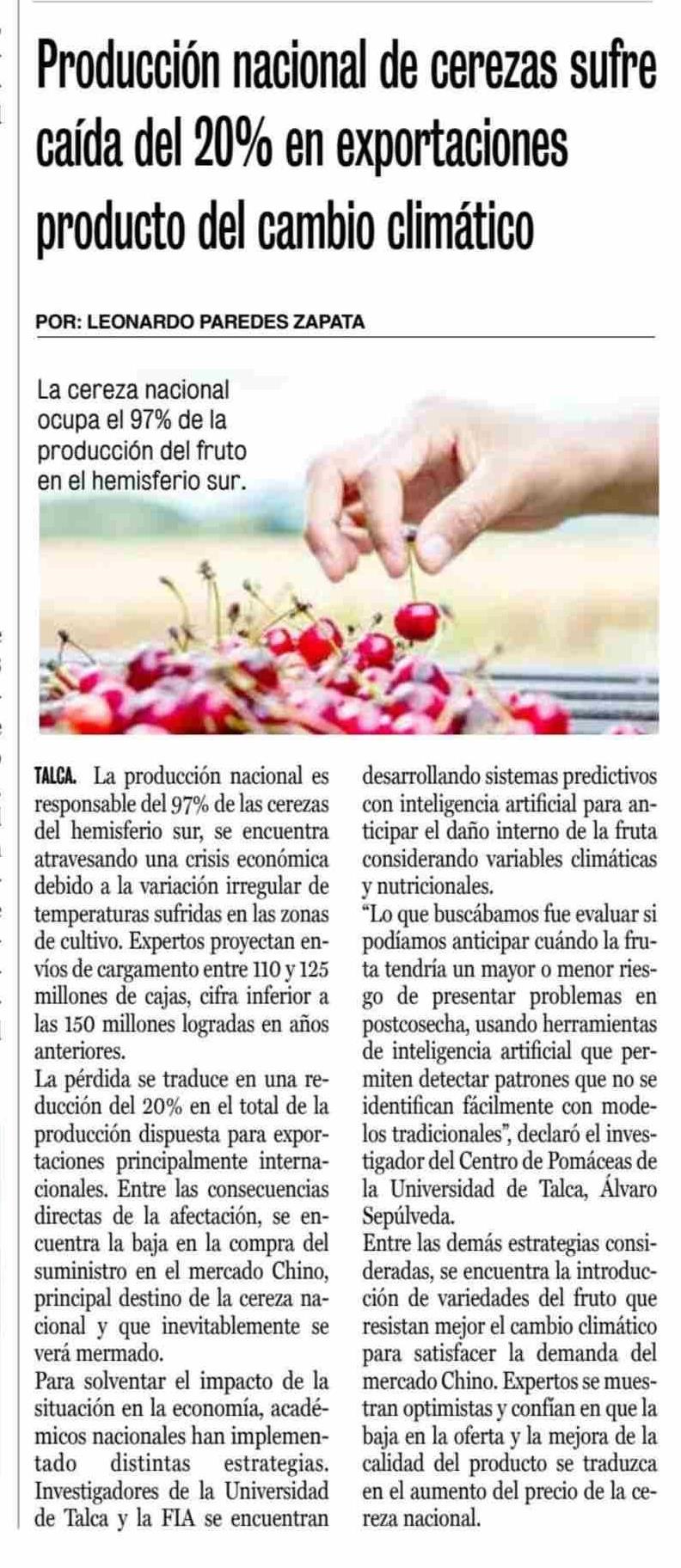 Producción nacional de cerezas sufre caída del 20% en exportaciones producto del cambio climático. Se refiere Álvaro Sepúlveda León, investigador del Centro de Pomáceas.