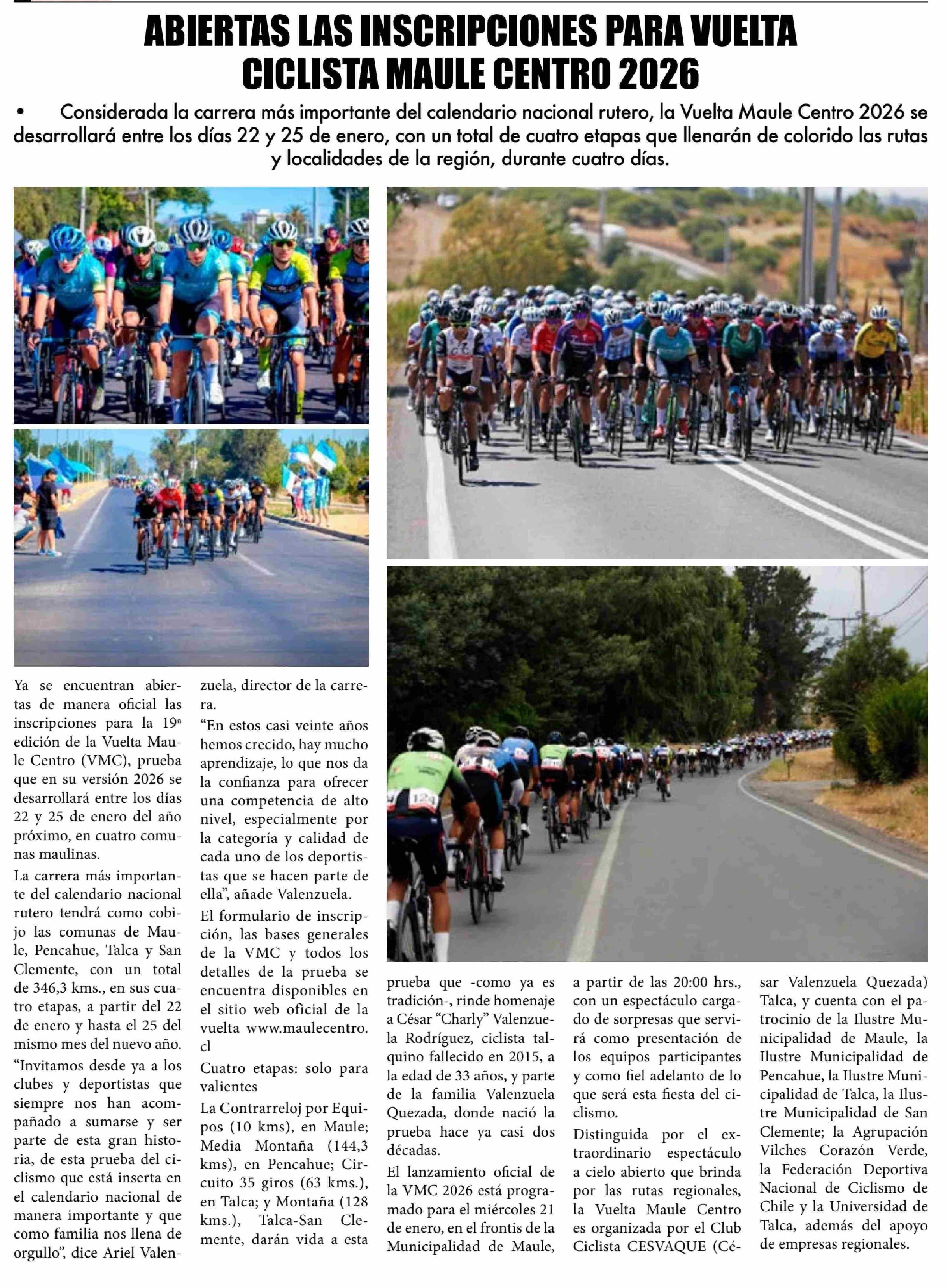 Abiertas las inscripciones para Vuelta Ciclista Maule Centro 2026. Se menciona la Universidad de Talca