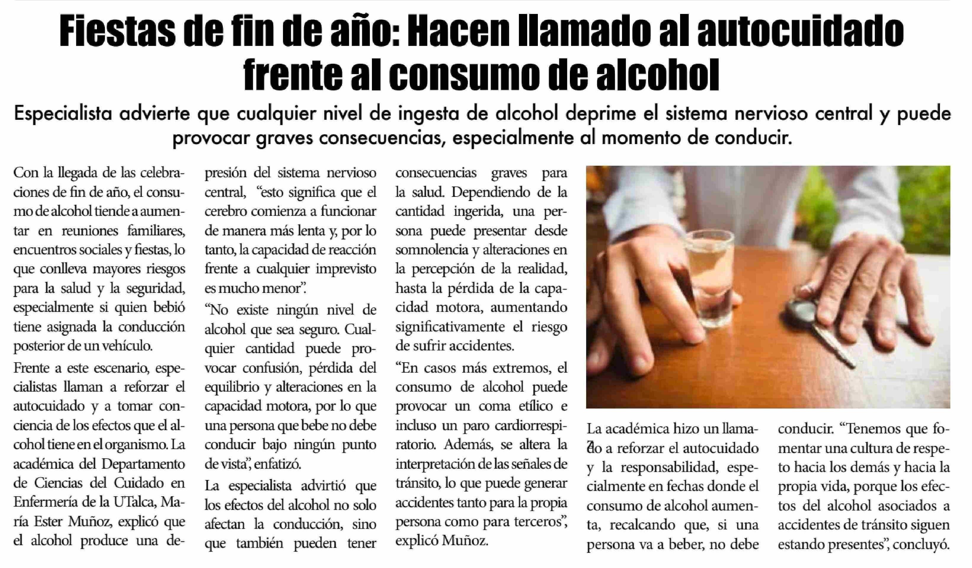 Fiestas de fin de año: Hacen llamado al autocuidado frente al consumo de alcohol. Se refiere María Ester Muñoz, académica del Departamento de Ciencias del Cuidado en Enfermería