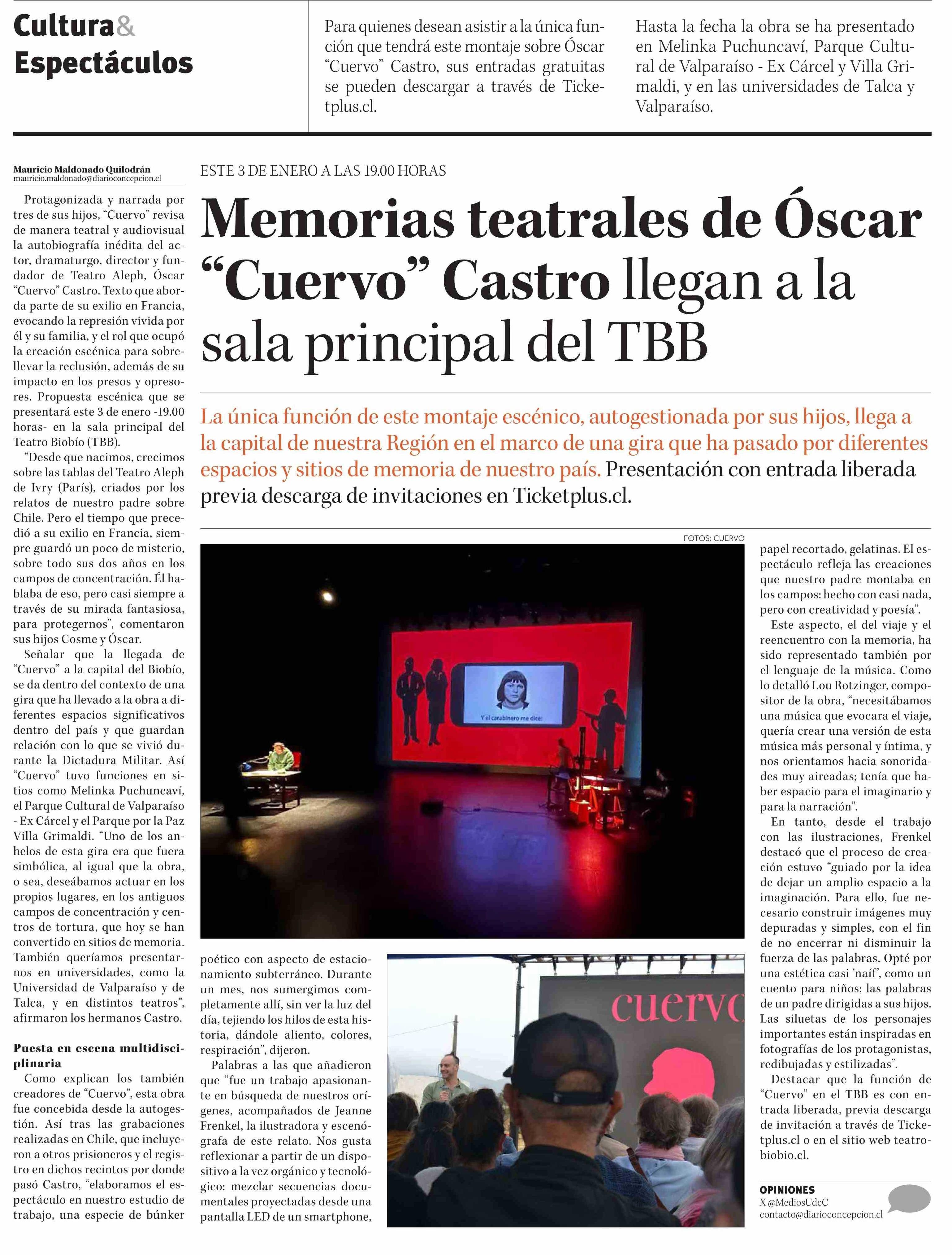Memorias teatrales de Óscar “Cuervo” Castro llegan a la sala principal del TBB. Se menciona la Universidad de Talca.