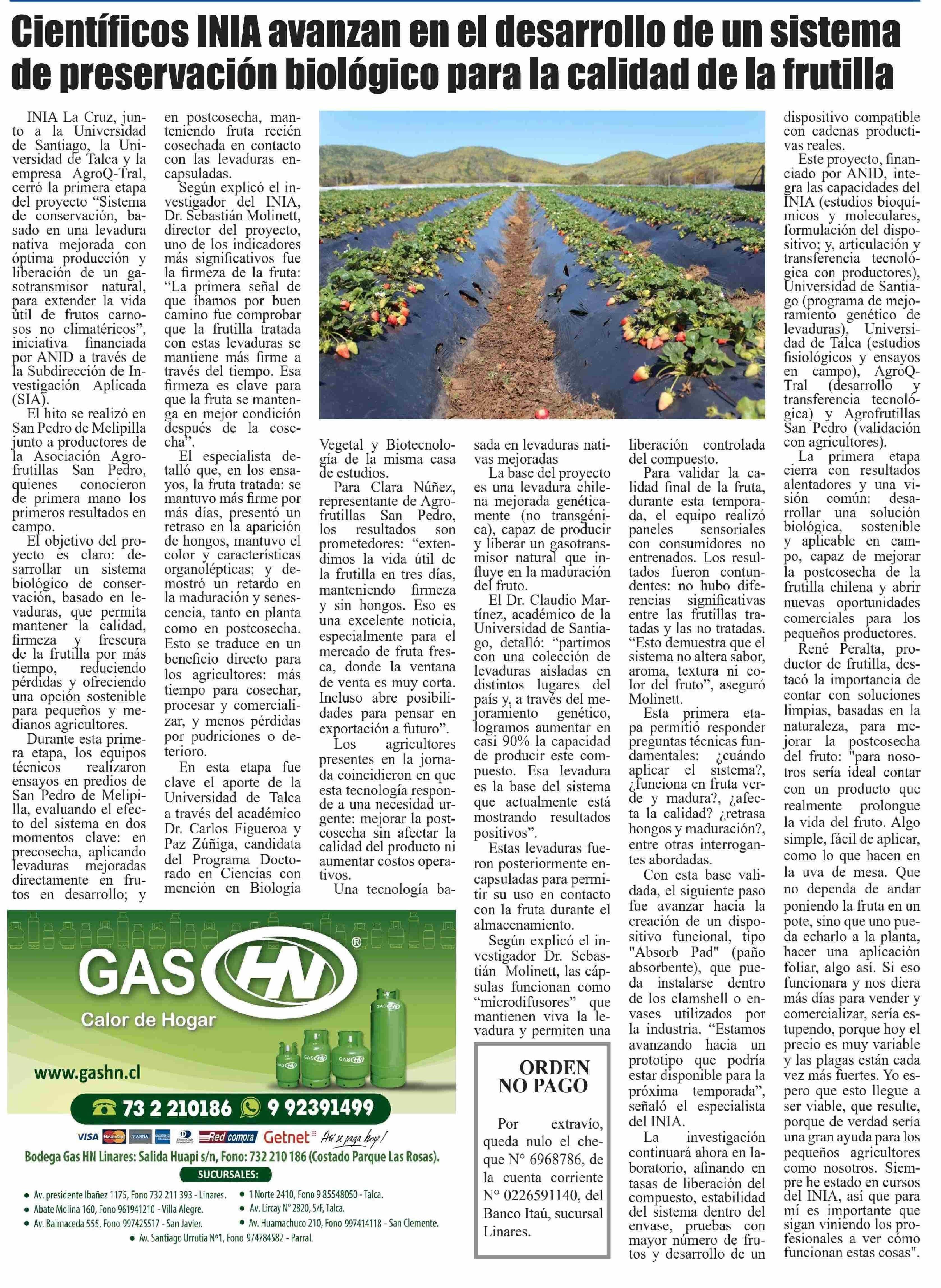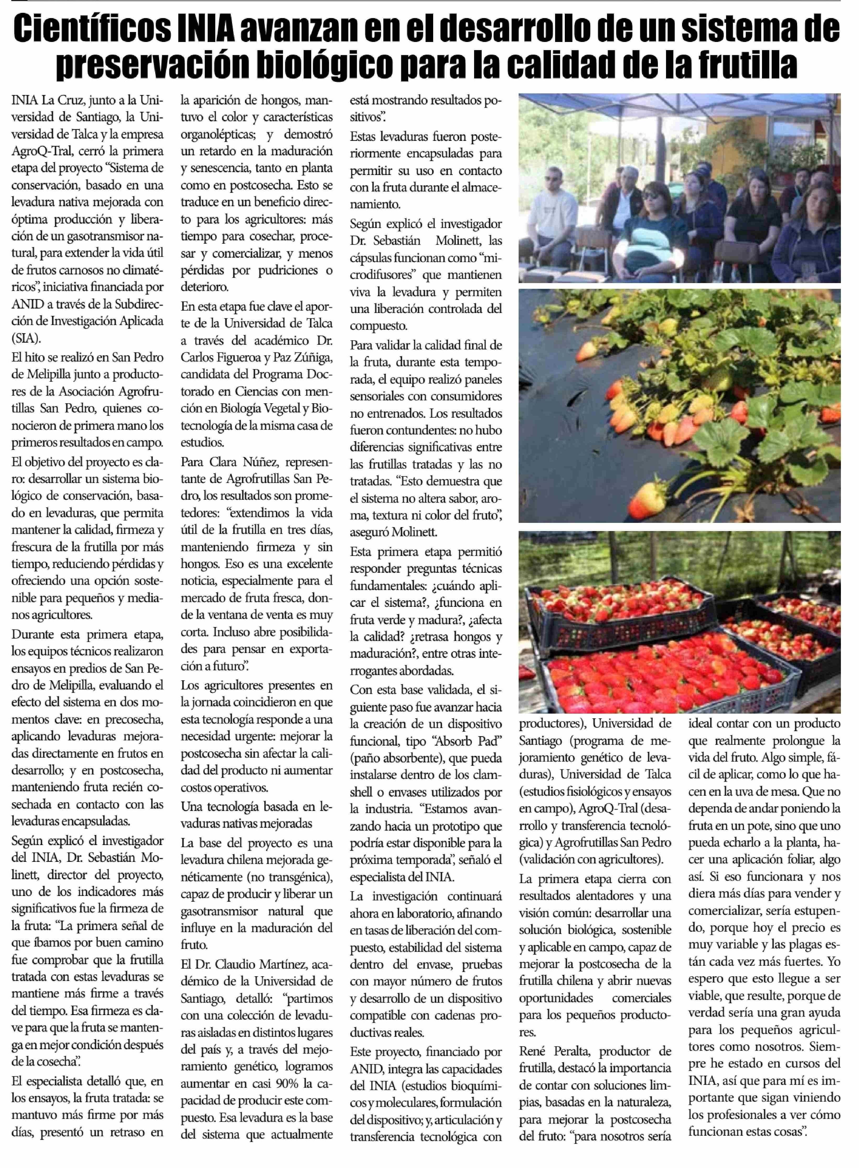 INIA alarga vida útil de frutilla con levadura nativa. Se menciona la Universidad de Talca.