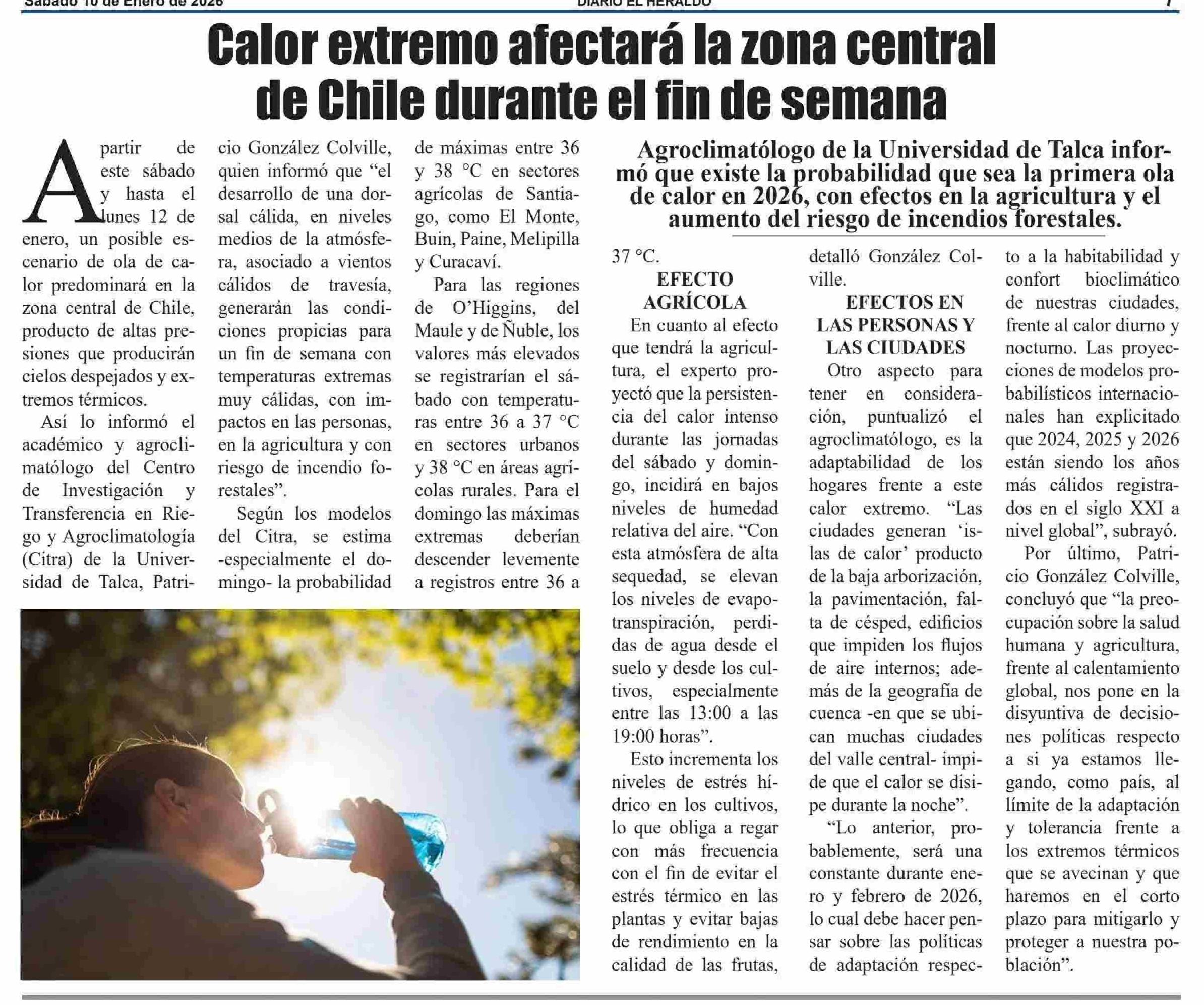 Ola de calor en la zona central marcaría el primer evento extremo de 2026: Talca podría superar los 37 °C. Se refiere Patricio González Colville, agroclimatólogo y académico del Centro de Investigación y Transferencia en Riego y Agroclimatología (CITRA).
