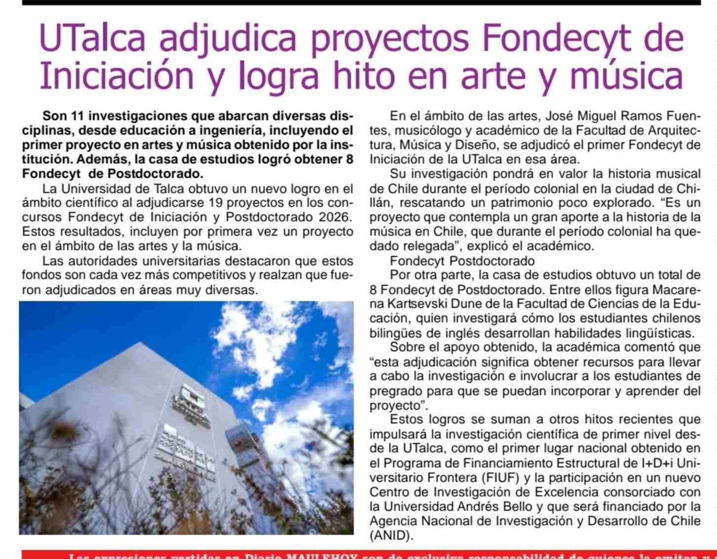 UTalca adjudica proyectos Fondecyt de Iniciación y logra hito en arte y música. Se refiere José Miguel Ramos Fuentes, musicólogo y académico de la Facultad de Arquitectura, Música y Diseño y Macarena Kartsevski Dune, académica de la Facultad de Ciencias de la Educación.