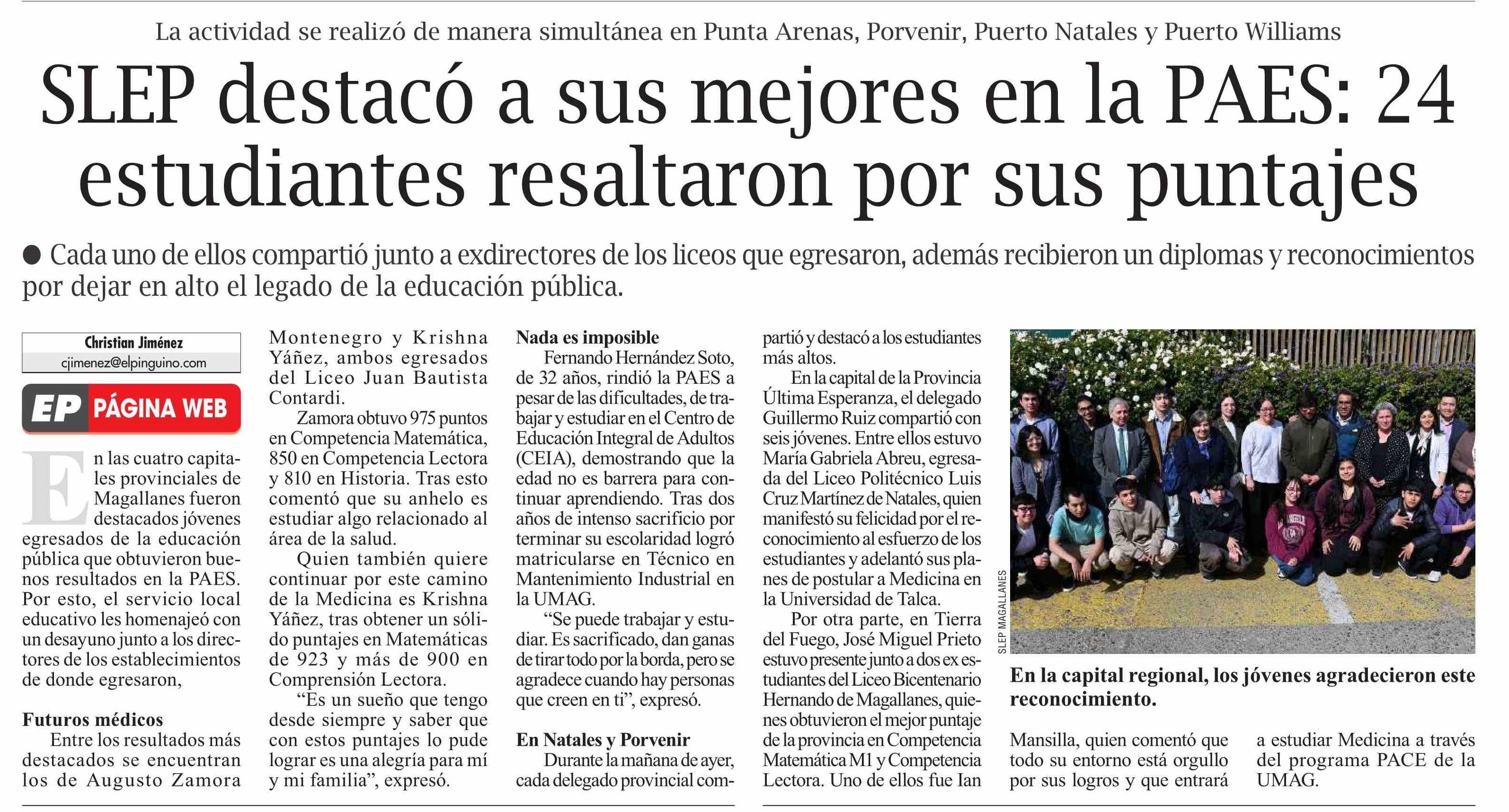 Delegación presidencial provincial de última esperanza reconoce a estudiantes de liceos públicos de puerto natales por destacados puntajes en la PAES. Se menciona la Universidad de Talca.