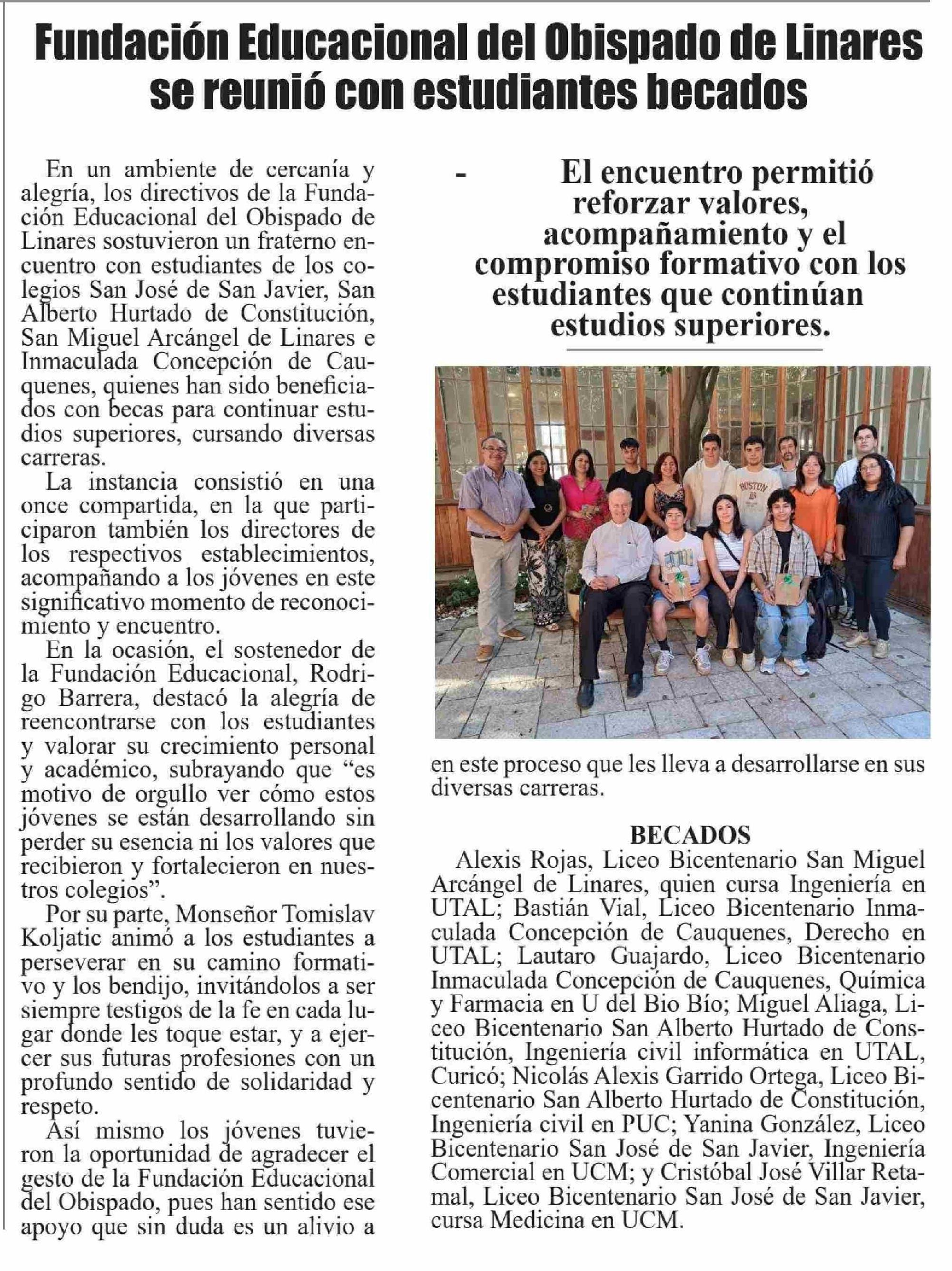 Fundación Educacional del Obispado de Linares se reunió con estudiantes becados. Se menciona la Universidad de Talca.