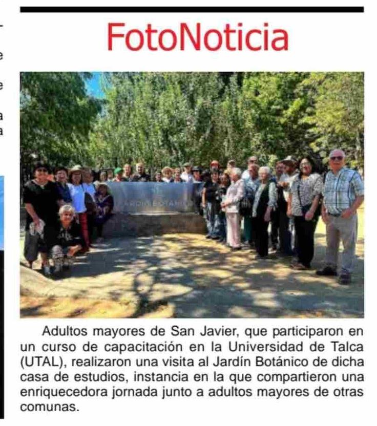 Adultos mayores de San Javier, que participaron en un curso de capacitación en la Universidad de Talca. Se menciona la Universidad de Talca.