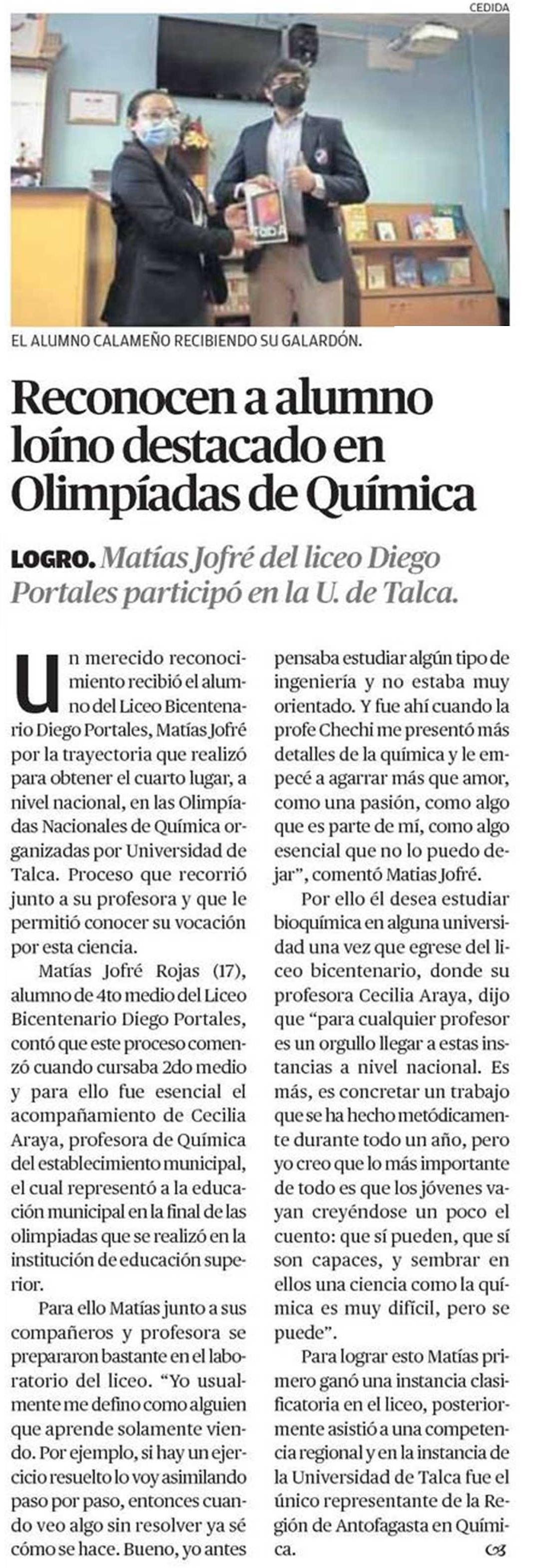 Liceo Diego Portales reconoce a alumno destacado en Olimpiadas de Química de Universidad de Talca.
