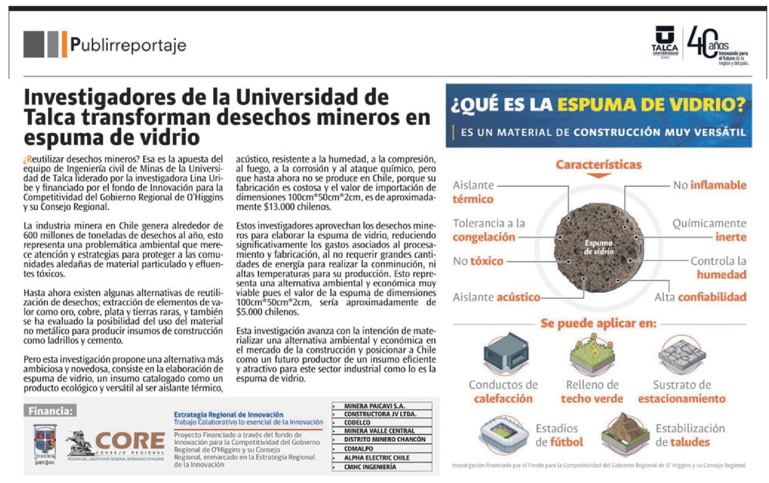 Investigadores de la Universidad de Talca transforman desechos mineros en espuma de vidrio.