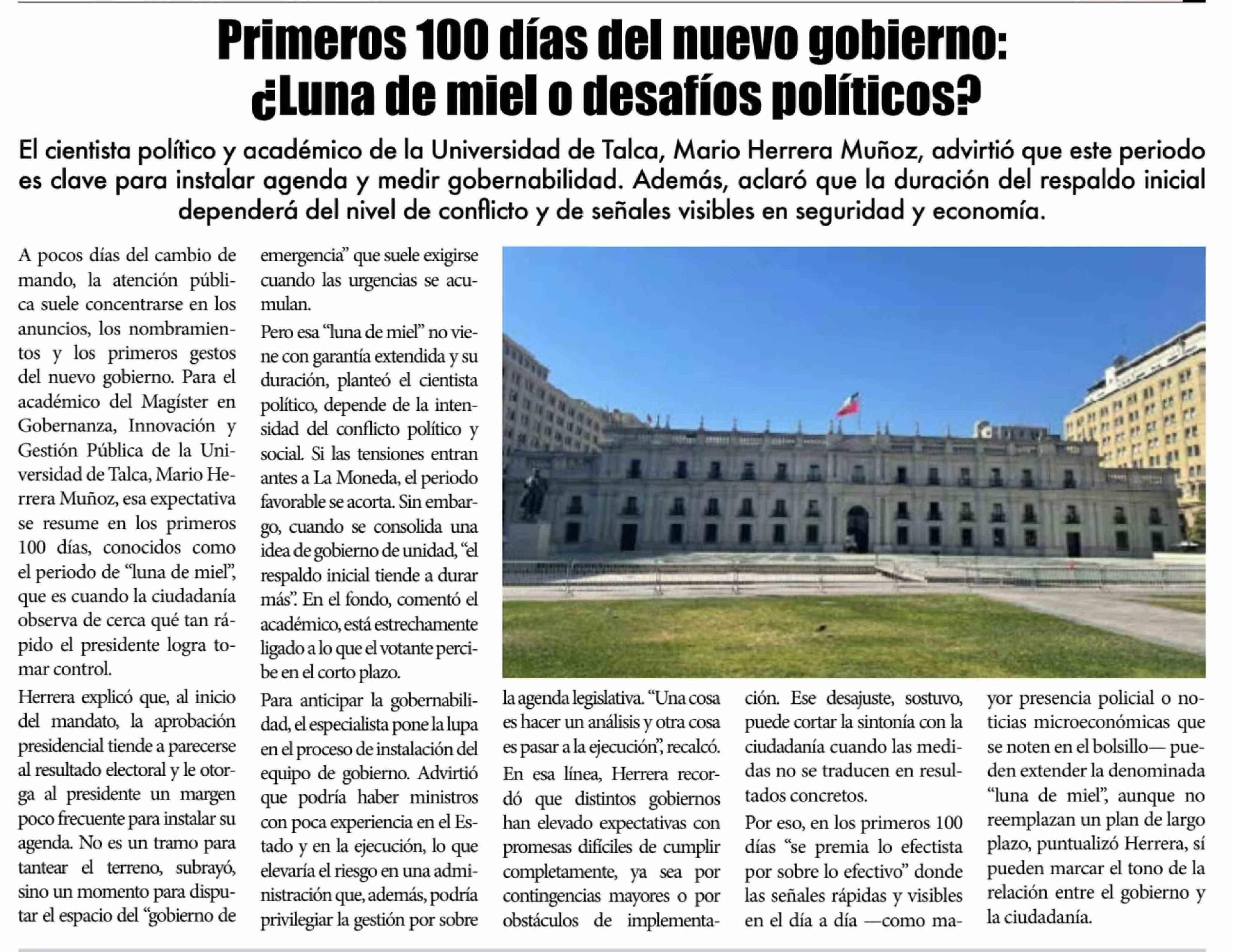 Primeros 100 días del nuevo gobierno: ¿Luna de miel o desafíos políticos? Se refiere Mario Herrera Muñoz, académico del Centro de Análisis Político (CAP-UTalca)