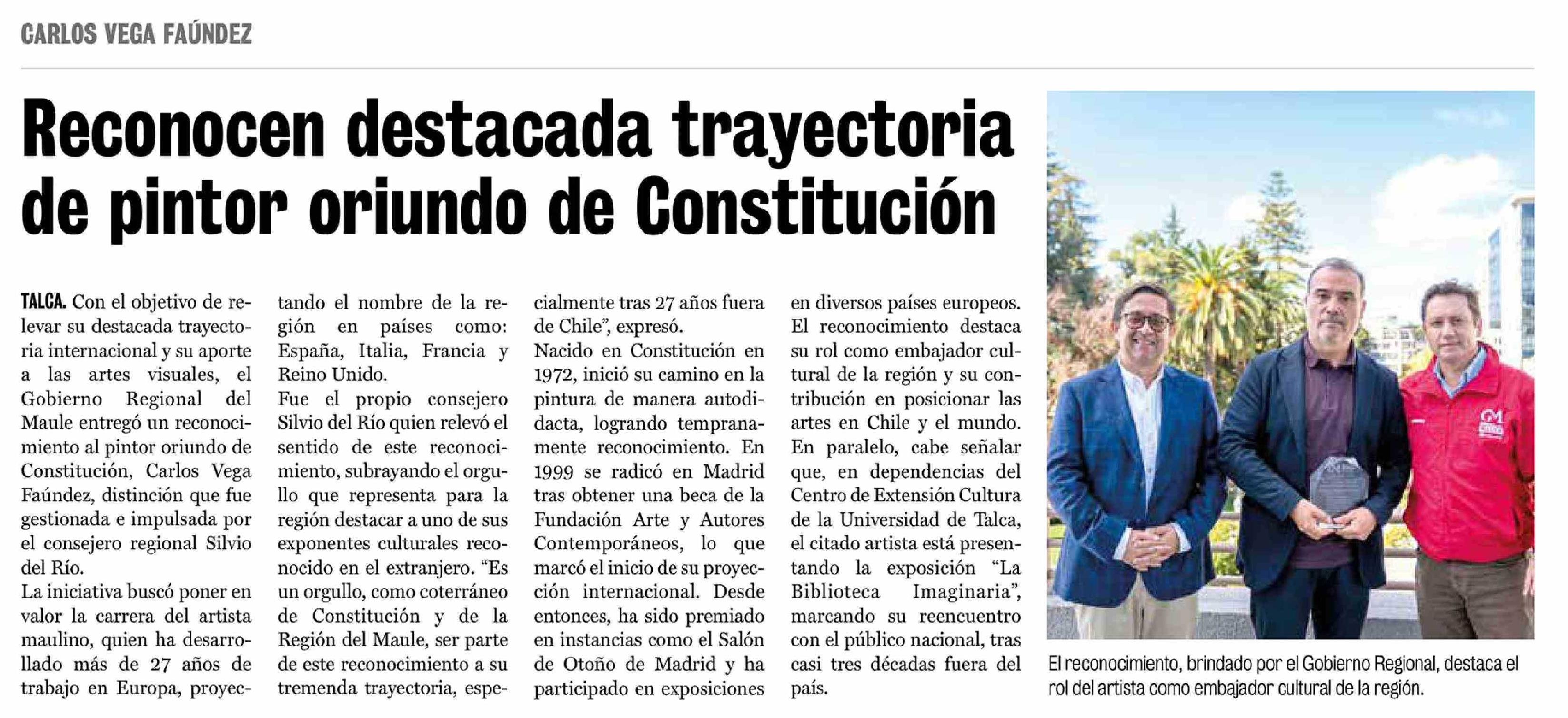 Reconocen destacada trayectoria de pintor oriundo de Constitución. Se menciona la Universidad de Talca.