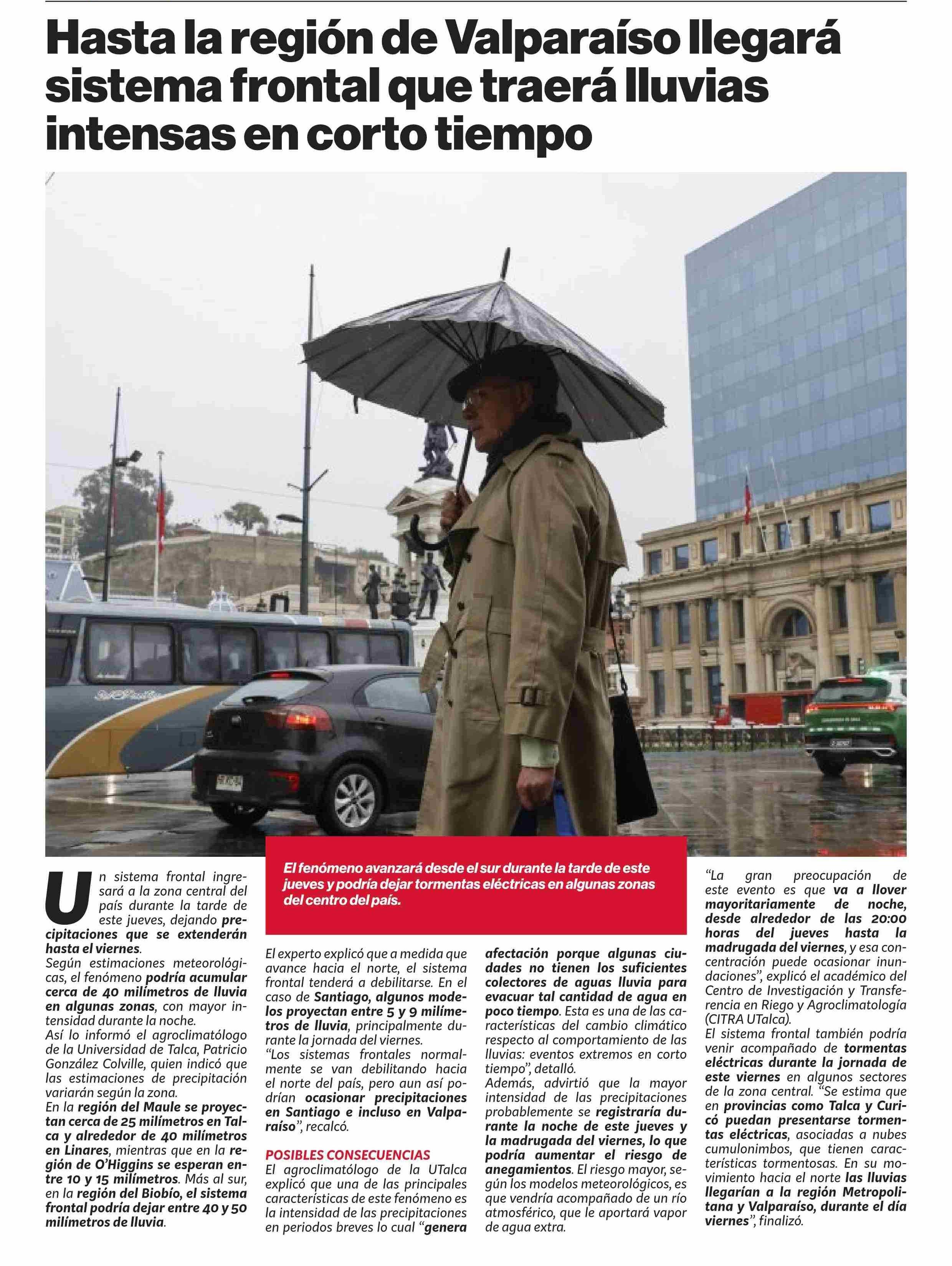 Sistema frontal traerá lluvias intensas en corto tiempo a la zona central. Se refiere Patricio González Colville, agroclimatólogo y académico del Centro de Investigación y Transferencia en Riego y Agroclimatología (CITRA)