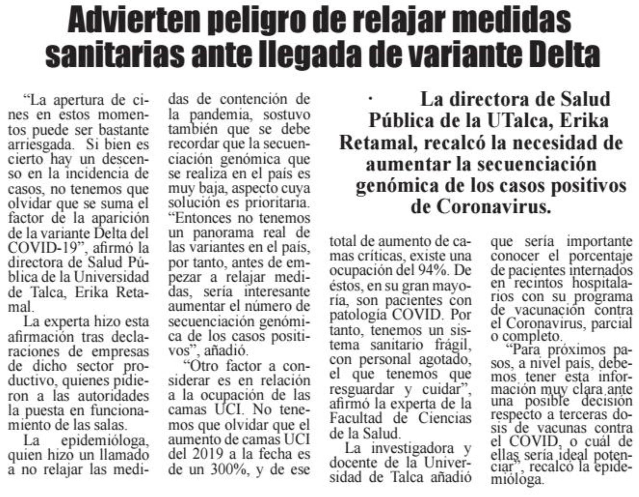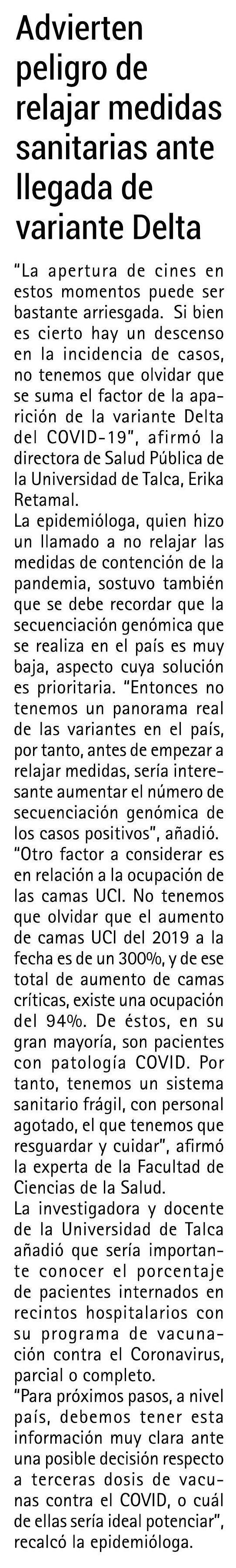 Portada: Llaman a no “relajar” las medidas sanitarias tras arribo de variante Delta.