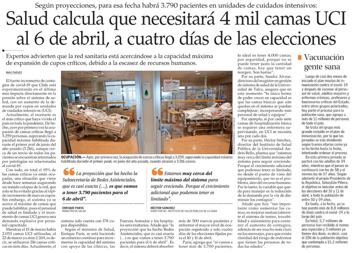 24 de marzo de 2021 EL MERCURIOSalud calcula que necesitará 4 mil camas UCI – al 6 de abril, a cuatro días de las elecciones. Se refiere Sandra Alvear, directora del Magíster en Gestión del Sistema de Salud de la UTalca. RADIO BIOBÍOPandemia en Chile: 4.948 contagios nuevos y 25 fallecidos en las últimas 24 horas. Se menciona opinión de Sandra Alvear, directora del Magíster en Gestión del Sistema de Salud de la UTalca.Curicó inauguró espacio deportivo para la práctica del tiro con arco. Iniciativa nace del proyecto de título del estudiante de Arquitectura de la UTalca, Antonio Chaparro. CANAL MEGA PLUSEntrevista a Erika Retamal, directora de Salud Pública de la Universidad de Talca. ADPRENSA.CLSalubrista advirtió que hay evidencia de que el transporte público “sí es una importante fuente de contagio de COVID-19”. Se refiere Erika Retamal, directora del Departamento de Salud Pública y Daniel Jiménez, director de Salud del Estudiante de la UTalca. DIALOGOSUR.CLSalubrista advirtió que hay evidencia de que el transporte público “sí es una importante fuente de contagio de COVID-19”. Se refiere Erika Retamal, directora del Departamento de Salud Pública y Daniel Jiménez, director de Salud del Estudiante de la UTalca. RADIOMAGALLANES.CLSalubrista advirtió que hay evidencia de que el transporte público “sí es una importante fuente de contagio de COVID-19”. Se refiere Erika Retamal, directora del Departamento de Salud Pública y Daniel Jiménez, director de Salud del Estudiante de la UTalca. MAULEE.CLUTalca participa de catedra Unesco sobre rol de las universidades públicas. SEXTANOTICIAS.CLUTalca participa de catedra Unesco sobre rol de las universidades públicas. ADPRENSA.CLAun año de la Ley de Teletrabajo: Laboralista afirma que debe ser mejorada. Se refiere Rodrigo Palomo, decano de la Facultad de Ciencias Jurídicas y Sociales de la UTalca. ELDINAMO.CLCumple un año: experto laboralista pide una serie de mejoras a Ley de Teletrabajo. Se refiere Rodrigo Palomo, decano de la Facultad de Ciencias Jurídicas y Sociales de la UTalca. EL HERALDOAun año de la Ley de Teletrabajo: Laboralista afirma que debe ser mejorada. Se refiere Rodrigo Palomo, decano de la Facultad de Ciencias Jurídicas y Sociales de la UTalca. REDMAULE.COMAun año de la Ley de Teletrabajo: Laboralista afirma que debe ser mejorada. Se refiere Rodrigo Palomo, decano de la Facultad de Ciencias Jurídicas y Sociales de la UTalca. MAULEE.CLAun año de la Ley de Teletrabajo: Laboralista afirma que debe ser mejorada. Se refiere Rodrigo Palomo, decano de la Facultad de Ciencias Jurídicas y Sociales de la UTalca. CHILLANONLINE.CLA un año de la Ley de Teletrabajo: Laboralista afirma que debe ser mejorada. Se refiere Rodrigo Palomo, decano de la Facultad de Ciencias Jurídicas y Sociales de la UTalca. SEXTANOTICIAS.CLA un año de la Ley de Teletrabajo: Laboralista afirma que debe ser mejorada. Se refiere Rodrigo Palomo, decano de la Facultad de Ciencias Jurídicas y Sociales de la UTalca. CANAL ANTOFAGASTA TELEVISIÓNEstudio de la UTalca reveló como viven en Chile los inmigrantes durante la pandemia. PORTALEDUCACION.CLEfecto de la pandemia en colegios: advierten que escolares tienen 1,3 años de retraso en los conocimientos que manejan. Se refiere Sebastián Donoso, director del Instituto de Investigación y Desarrollo Educacional (IIDE) de la UTalca. SEPTIMAPAGINANOTICIAS.CLEfecto de la pandemia en colegios: advierten que escolares tienen 1,3 años de retraso en los conocimientos que manejan. Se refiere Sebastián Donoso, director del Instituto de Investigación y Desarrollo Educacional (IIDE) de la UTalca. LINARESENLINEA.CLEfecto de la pandemia en colegios: advierten que escolares tienen 1,3 años de retraso en los conocimientos que manejan. Se refiere Sebastián Donoso, director del Instituto de Investigación y Desarrollo Educacional (IIDE) de la UTalca. SEXTANOTICIAS.CLEfecto de la pandemia en colegios: advierten que escolares tienen 1,3 años de retraso en los conocimientos que manejan. Se refiere Sebastián Donoso, director del Instituto de Investigación y Desarrollo Educacional (IIDE) de la UTalca.