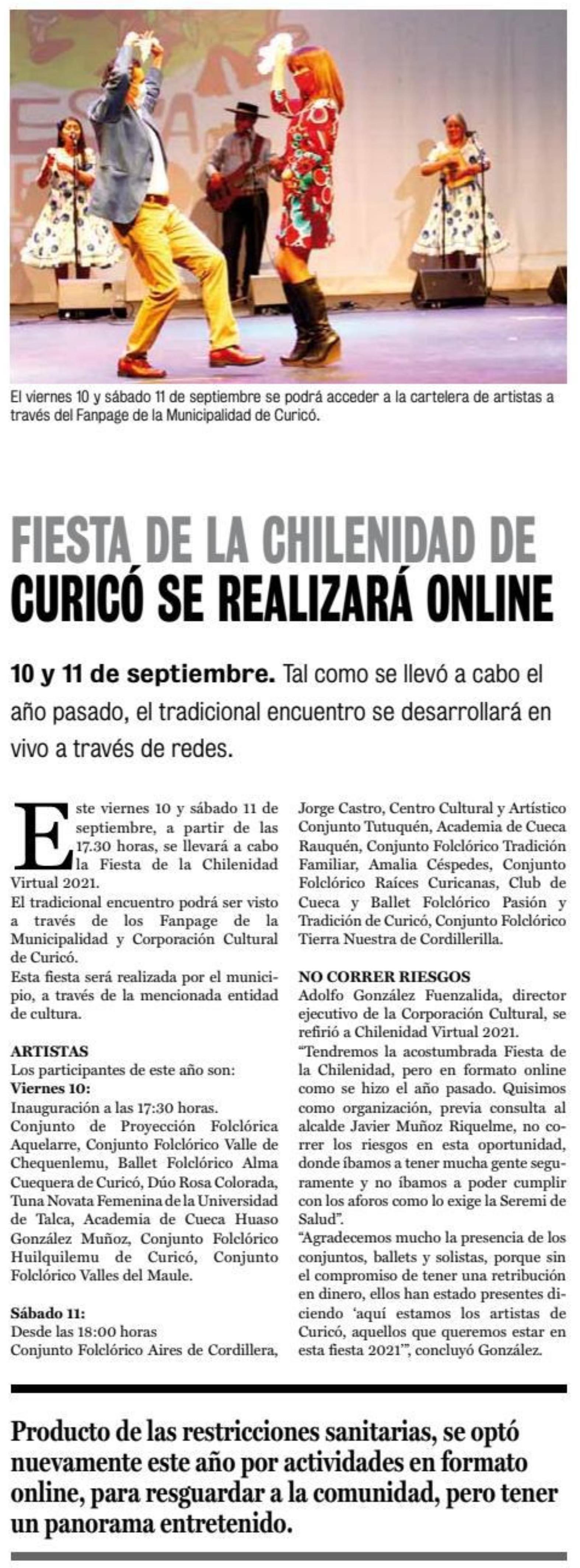 Fiesta de la chilenidad de Curicó se realizará online. Se menciona a la UTalca.