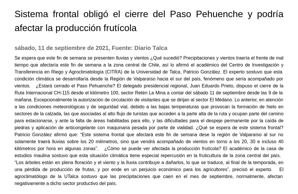 Sistema frontal obligó el cierre del paso Pehuenche y podría afectar la producción frutícola. Se refiere Patricio González, agroclimatólogo de la UTalca.