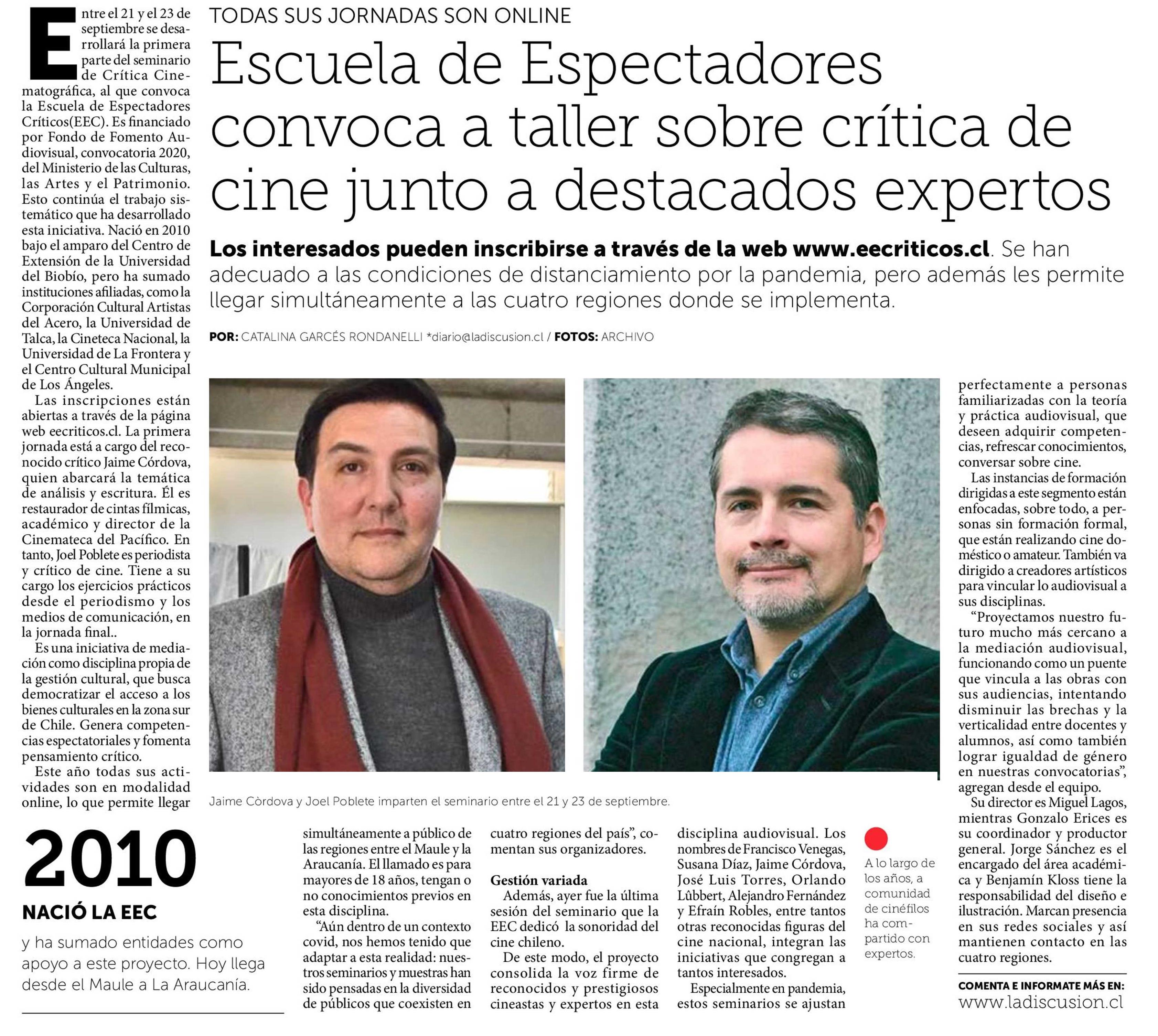 Escuela de Espectadores convoca a taller sobre crítica de cine junto a destacados expertos. Se menciona a la UTalca.