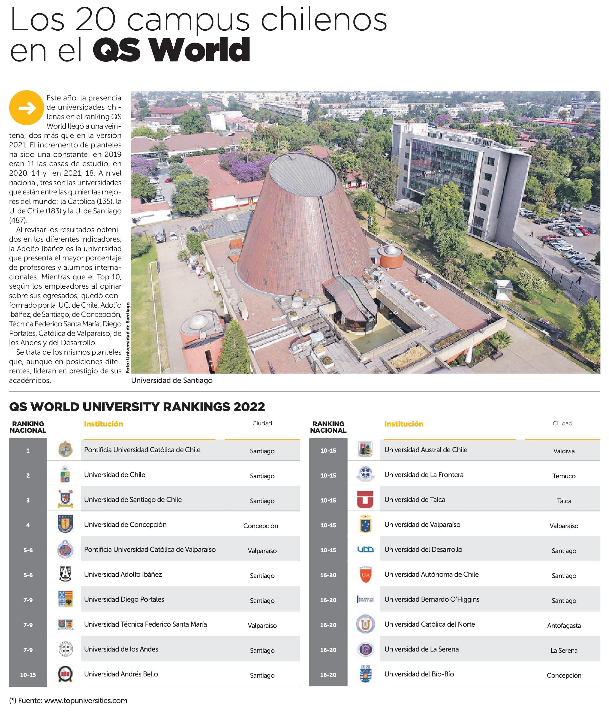 Los 20 campus chilenos en el QS World. Se menciona a la UTalca.