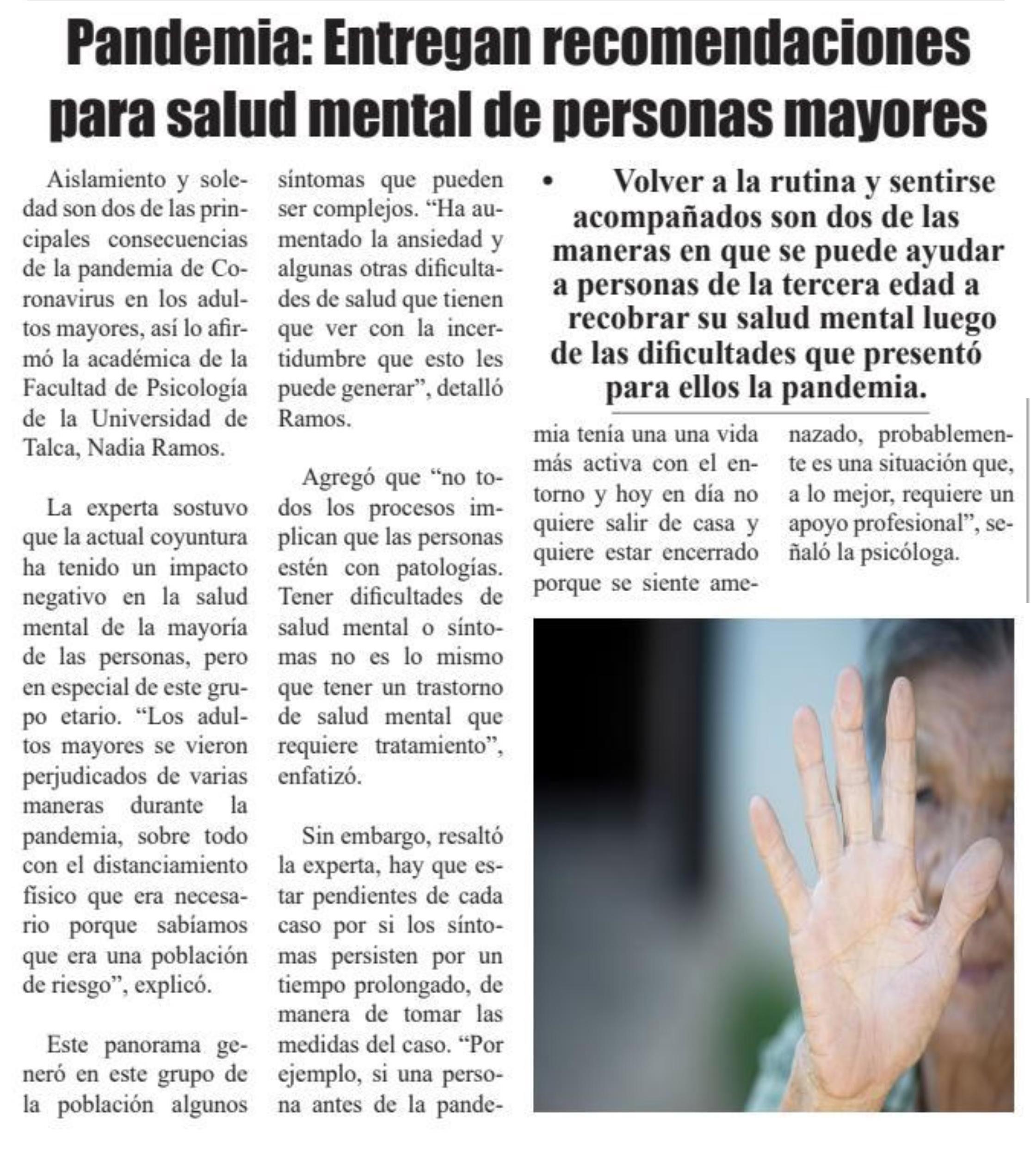 Pandemia: Entregan recomendaciones para salud mental de personas mayores. Se refiere Nadia Ramos, académica de la Facultad de Psicología de la UTalca.