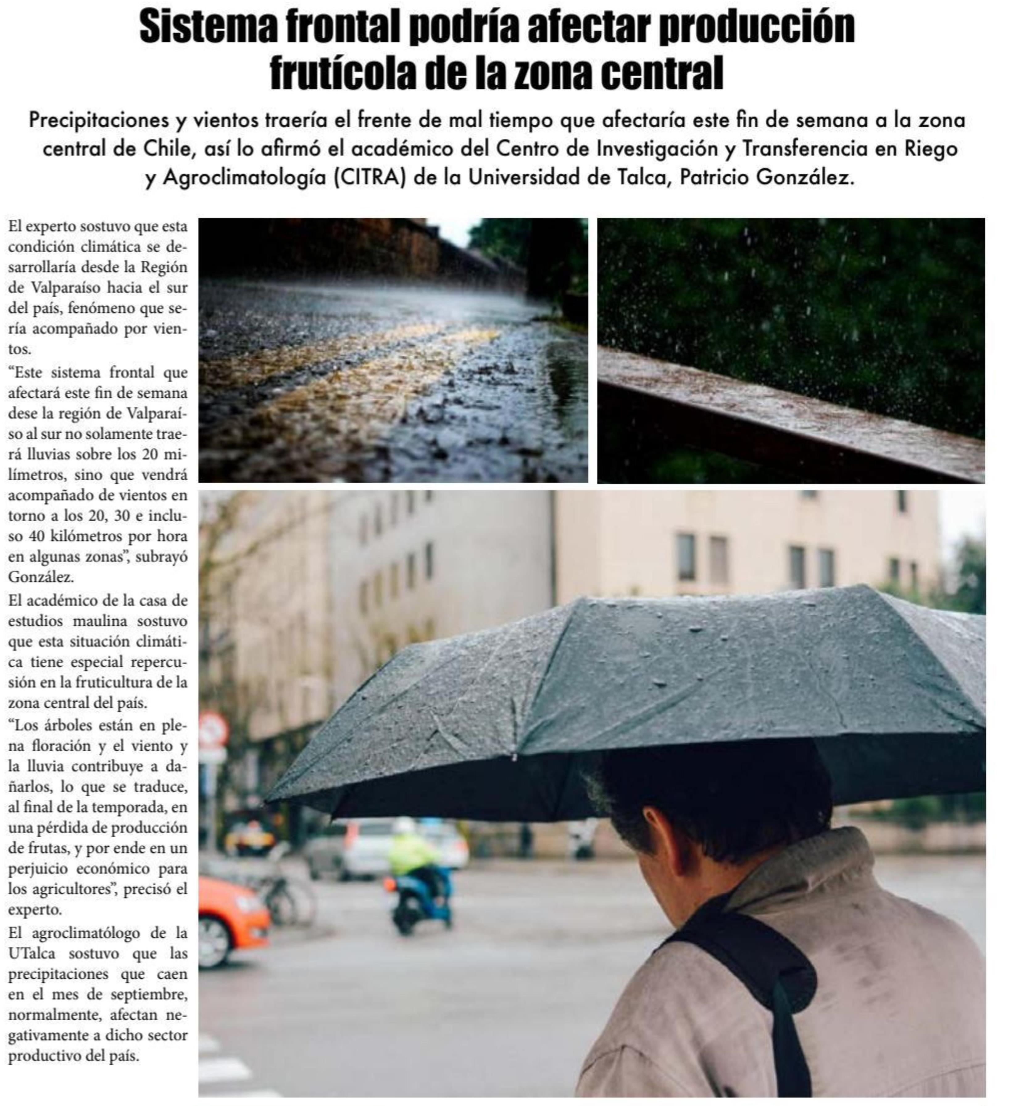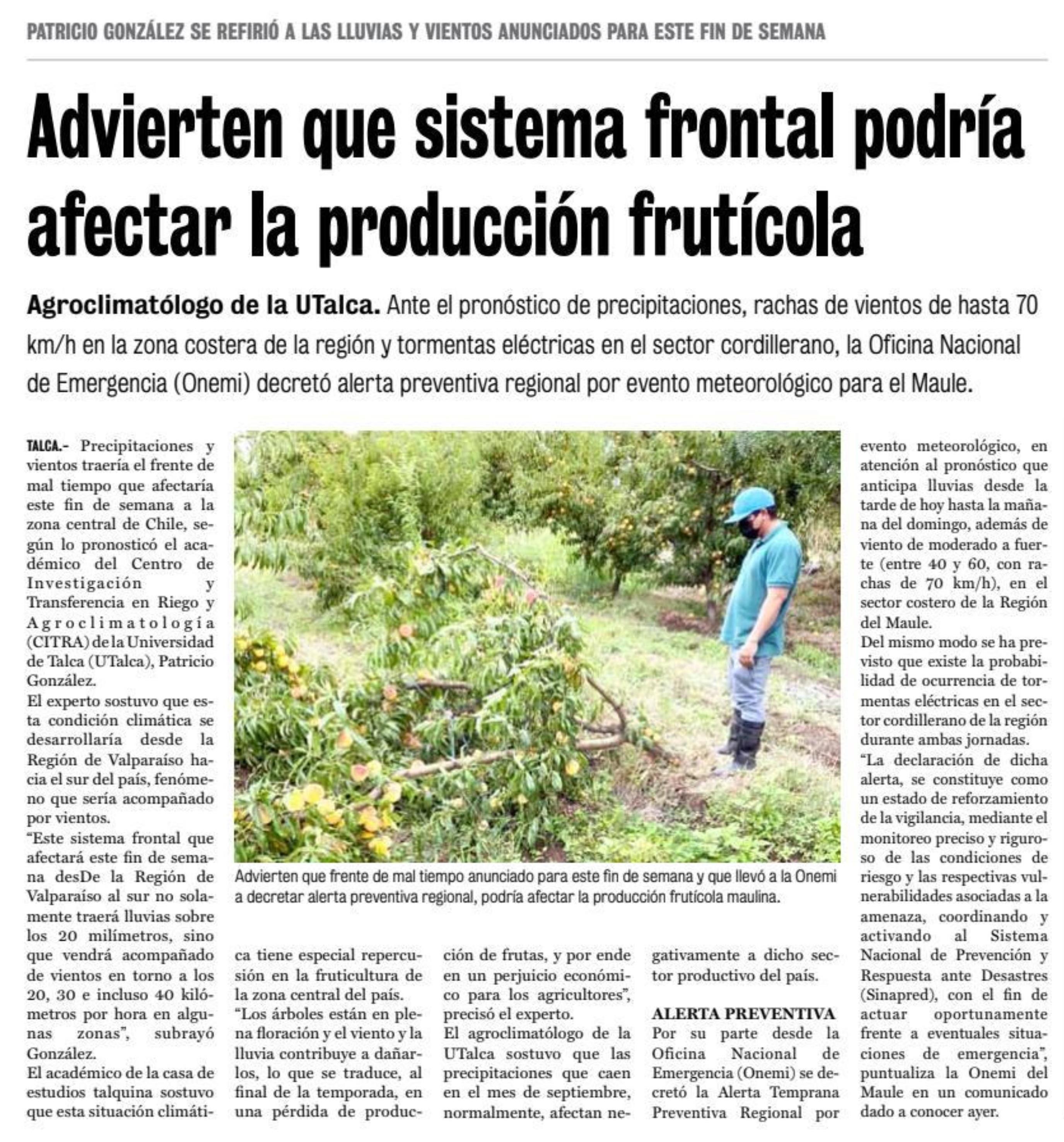 Sistema frontal: Advierten daños en producción frutícola regional y decretan alerta temprana preventiva. Se refiere Patricio González, agroclimatólogo de la UTalca.