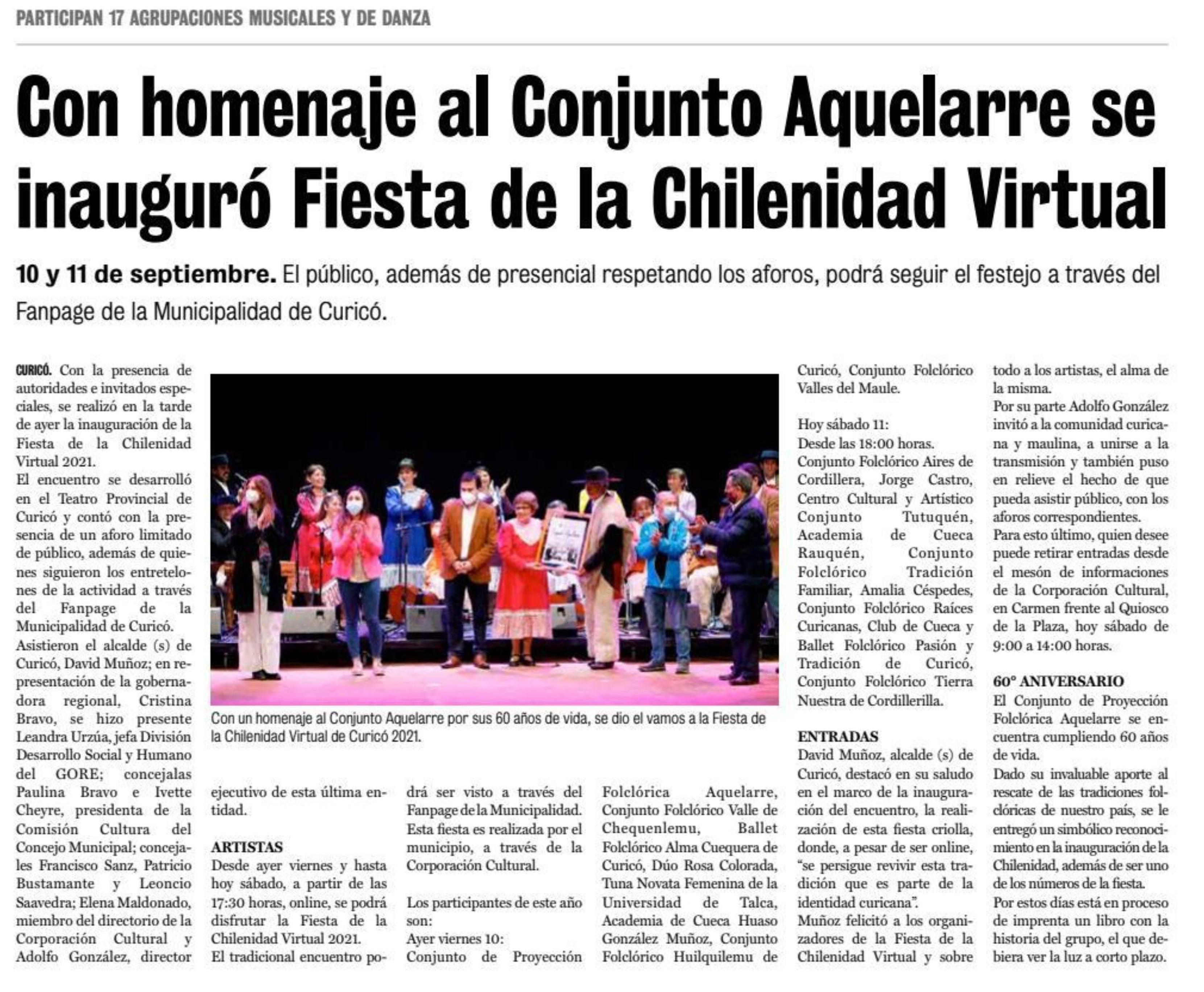 Con homenaje al Conjunto Aquelarre se inauguró Fiesta de la Chilenidad Virtual. Se menciona a la UTalca.
