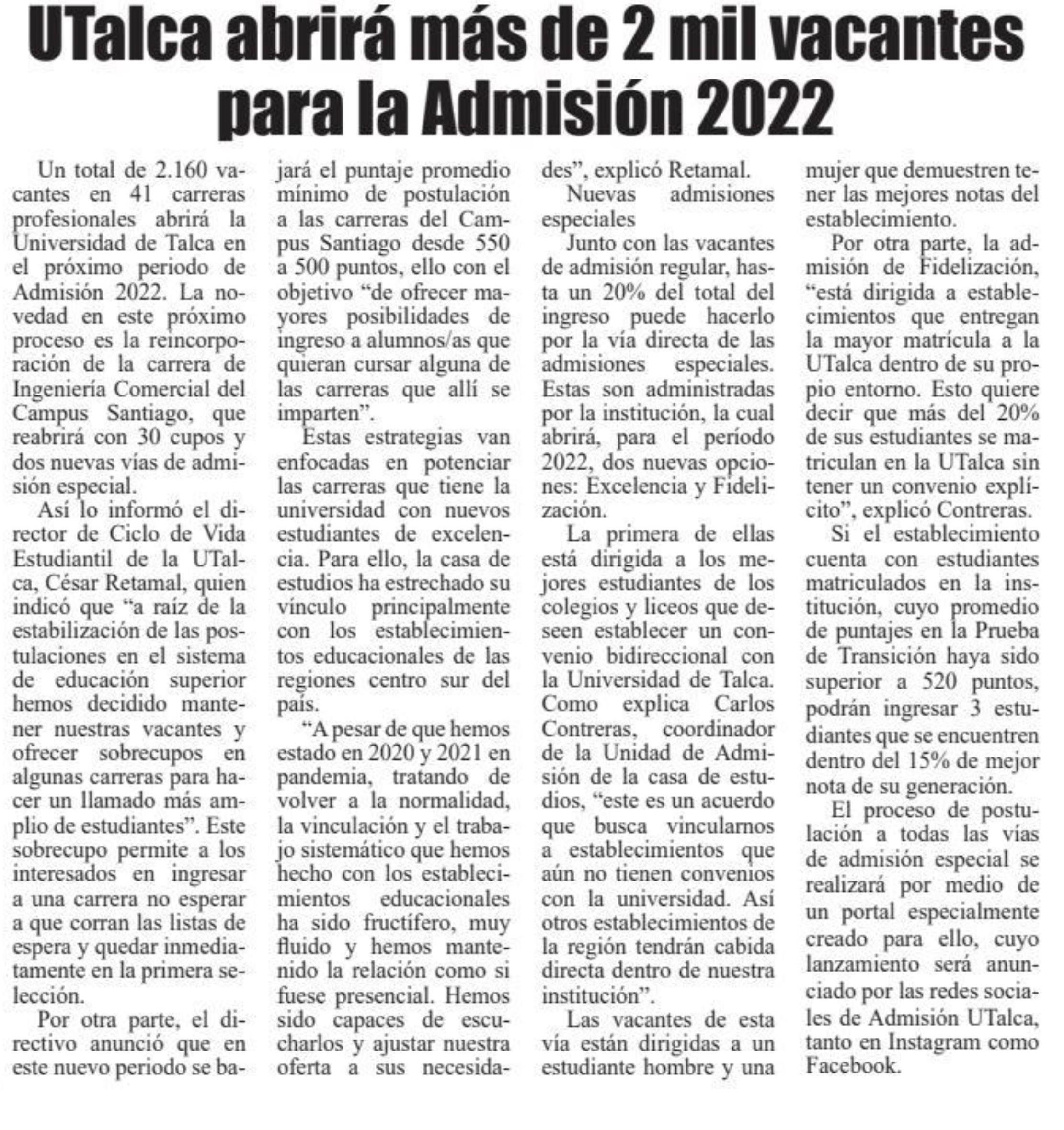 UTalca abrirá más de 2 mil vacantes para la Admisión 2022.