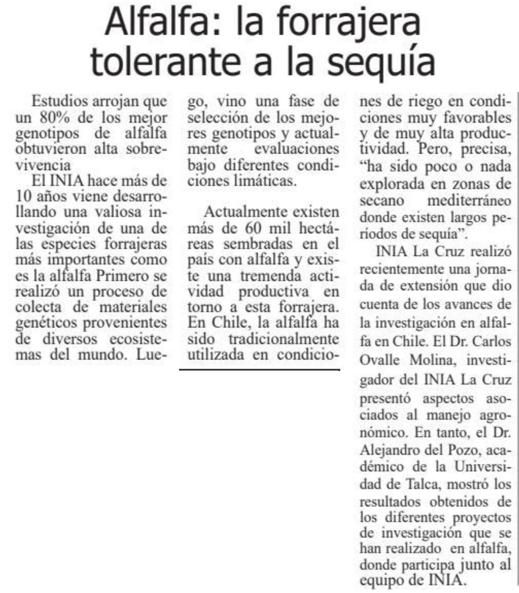 Alfalfa: la forrajera tolerante a la sequía. Se refiere Alejandro del Pozo, académico de la Facultad de Ciencias Agrarias de la UTalca.