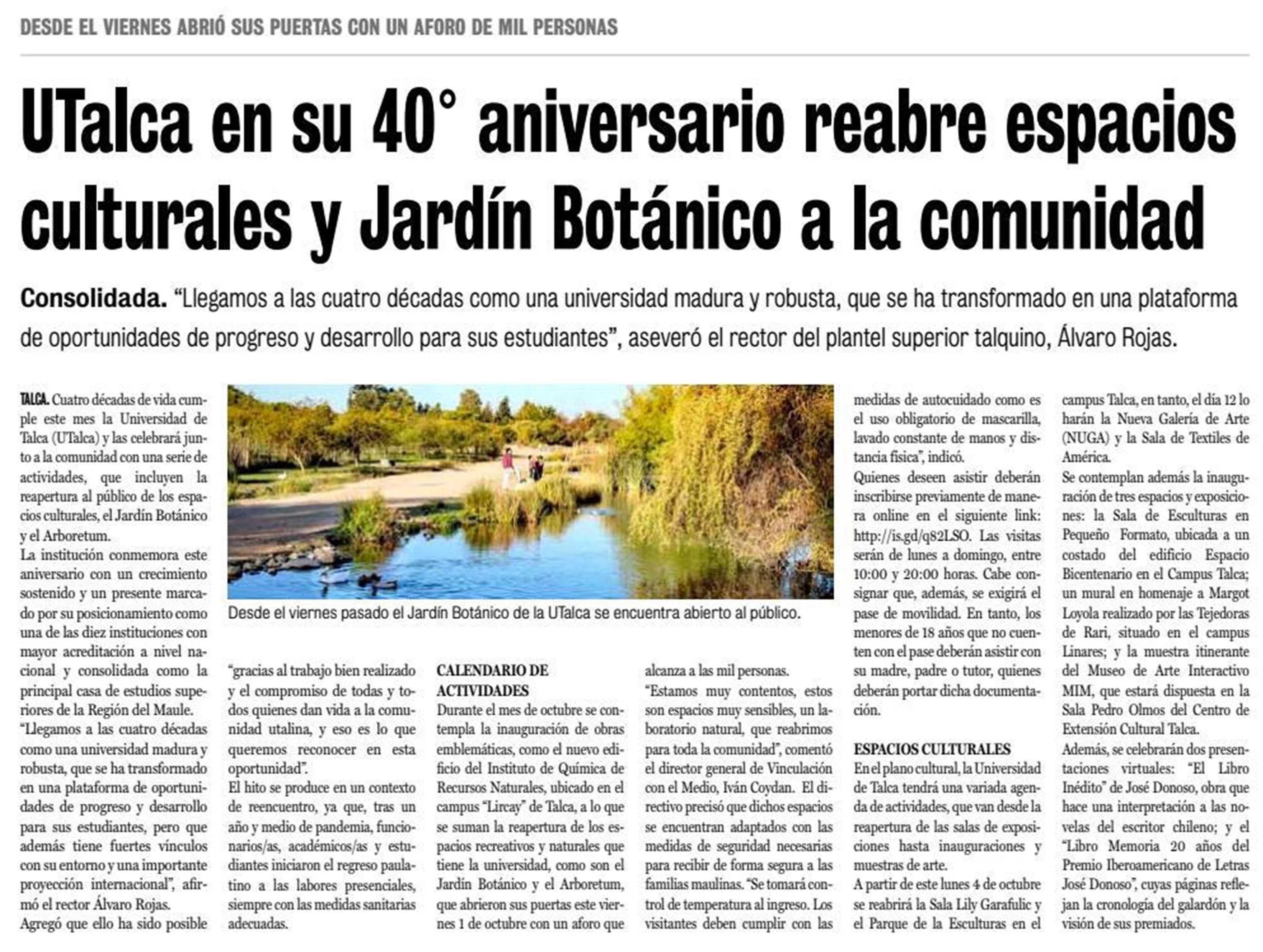 UTalca en su 40” aniversario reabre espacios culturales y Jardín Botánico a la comunidad.