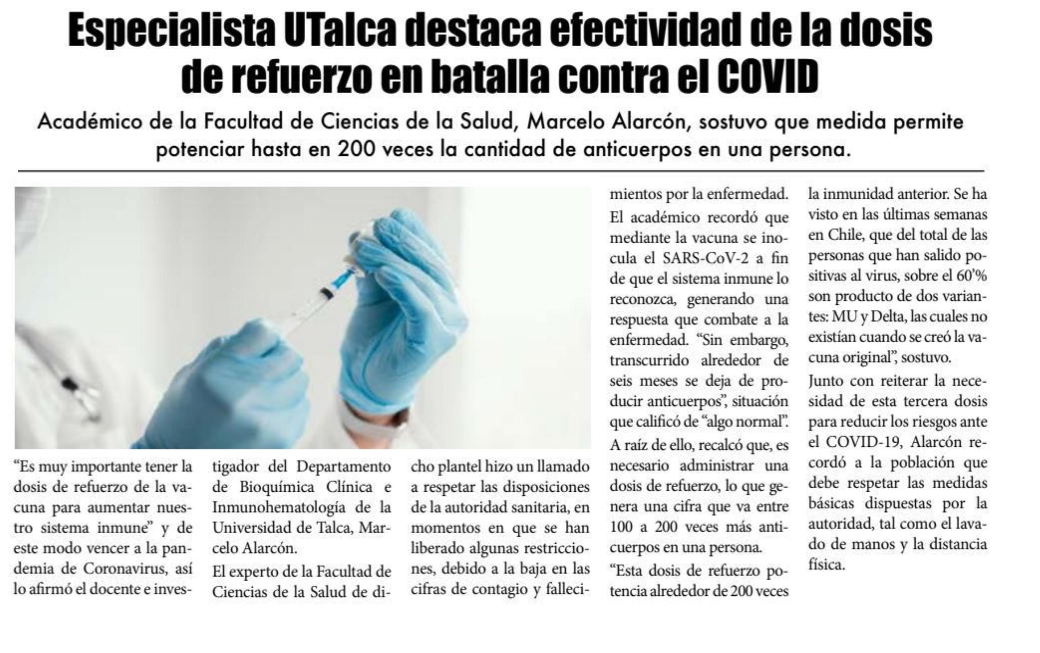 Especialista UTalca destaca efectividad de la dosis de refuerzo en batalla contra el COVID.