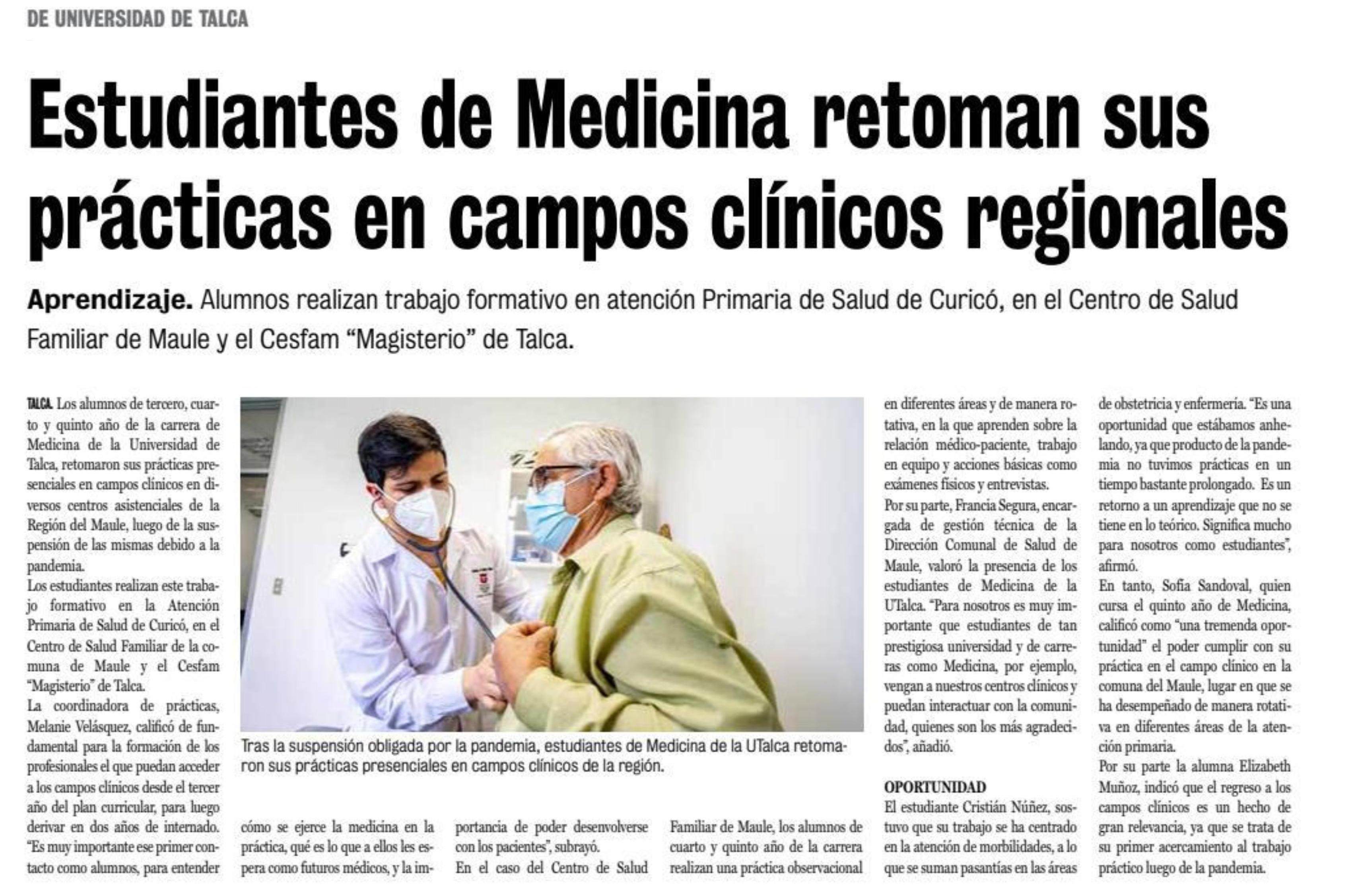 Portada: Estudiantes de Medicina de la UTalca retoman prácticas en campos clínicos en la región.
