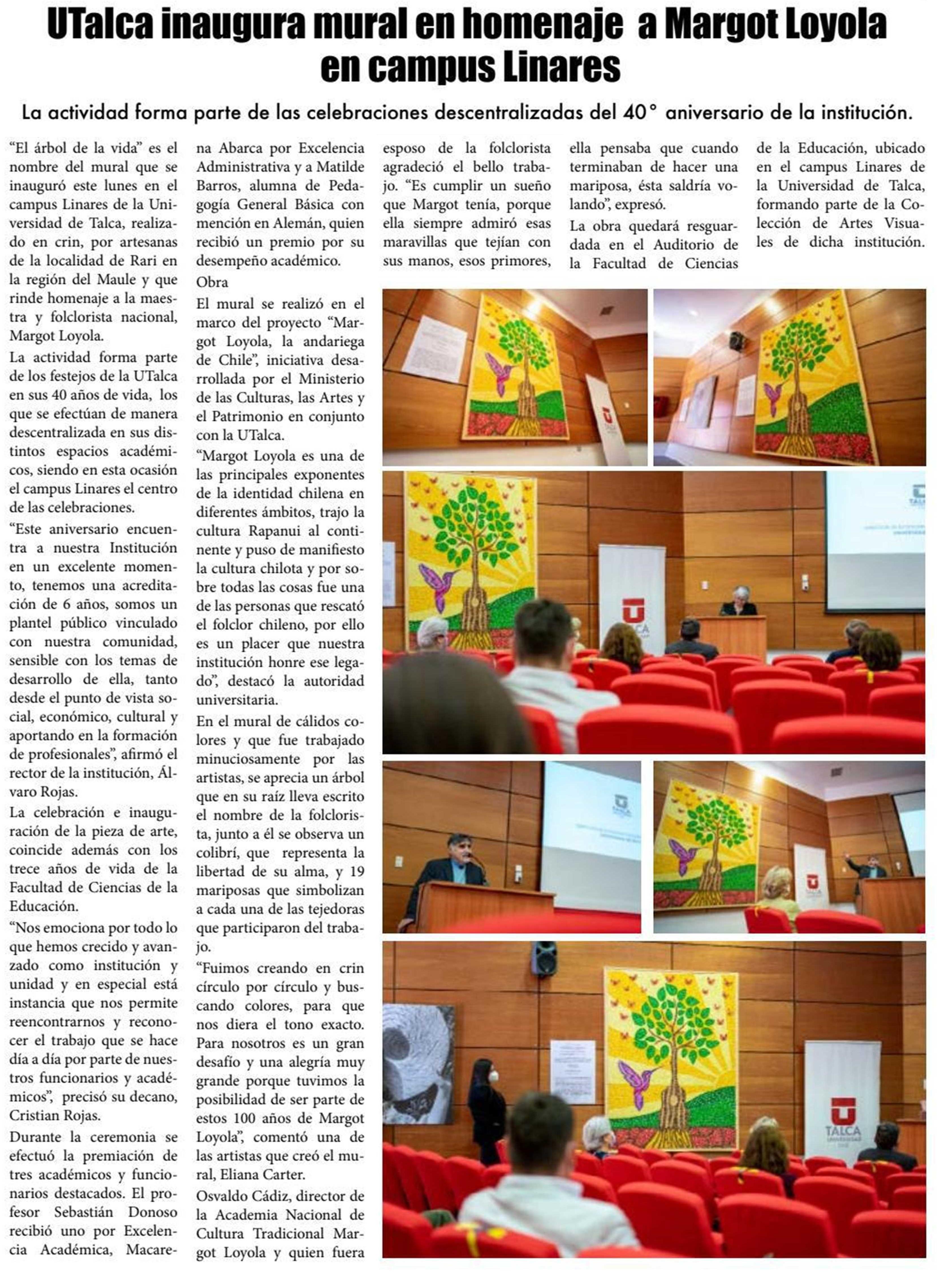 Portada: UTalca inaugura mural en homenaje a Margot Loyola en campus Linares.