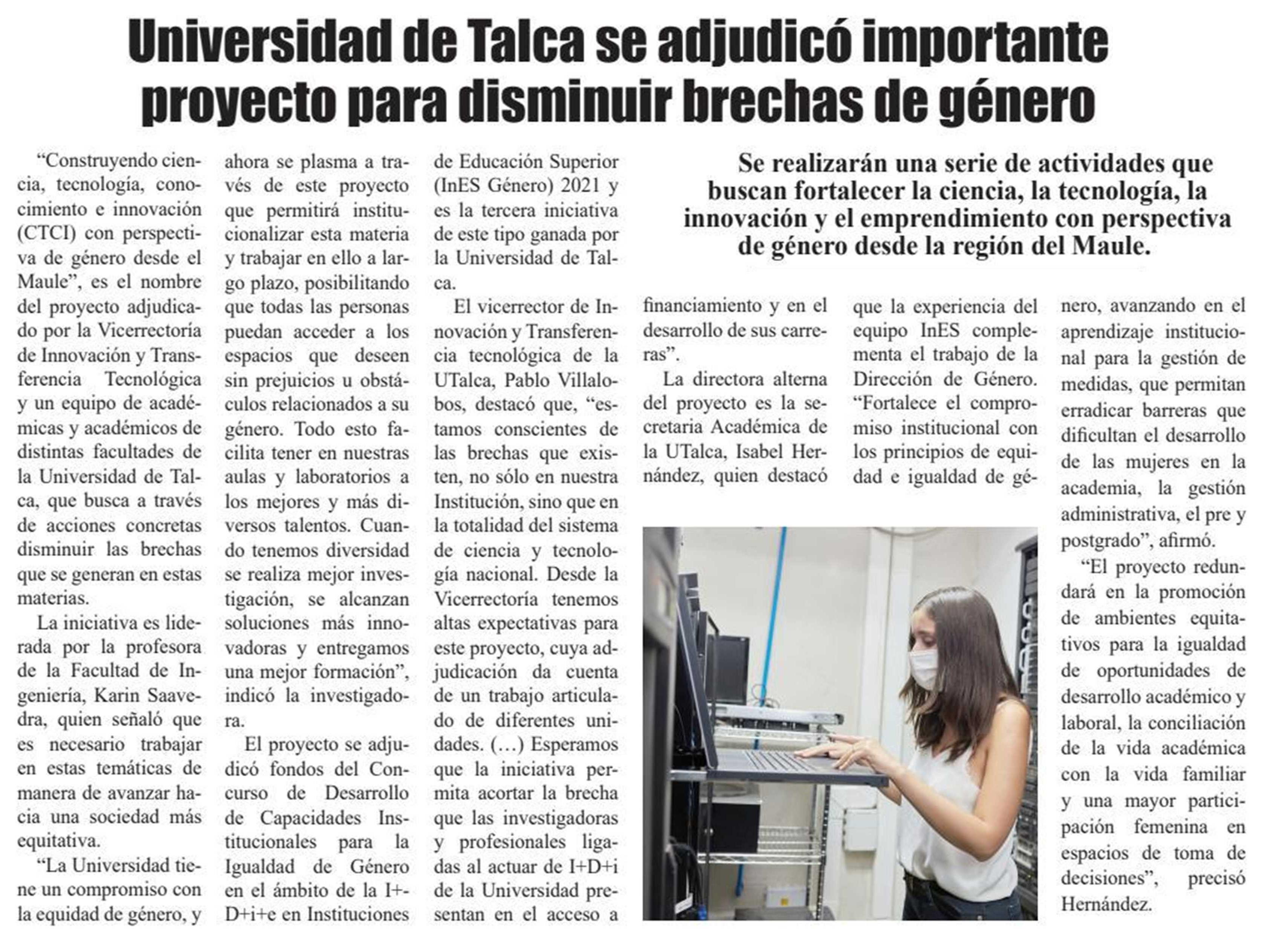 Universidad de Talca se adjudicó importante proyecto para disminuir brechas de género.