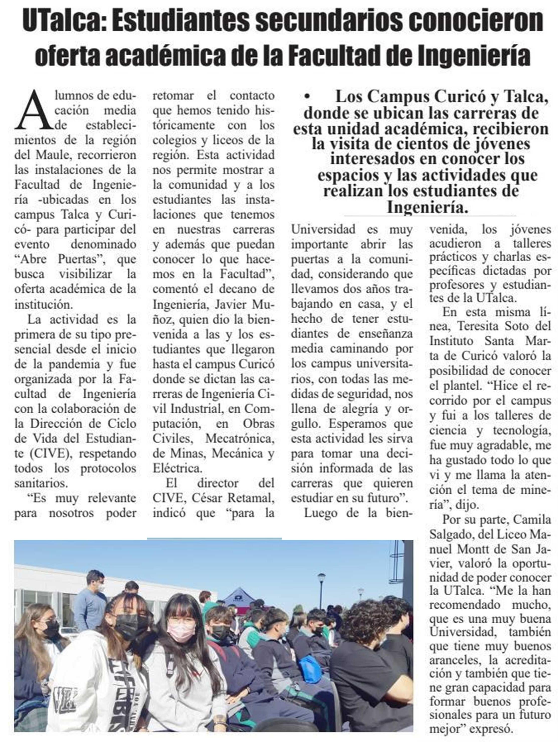 UTalca: Estudiantes secundarios conocieron oferta académica de la Facultad de Ingeniería.