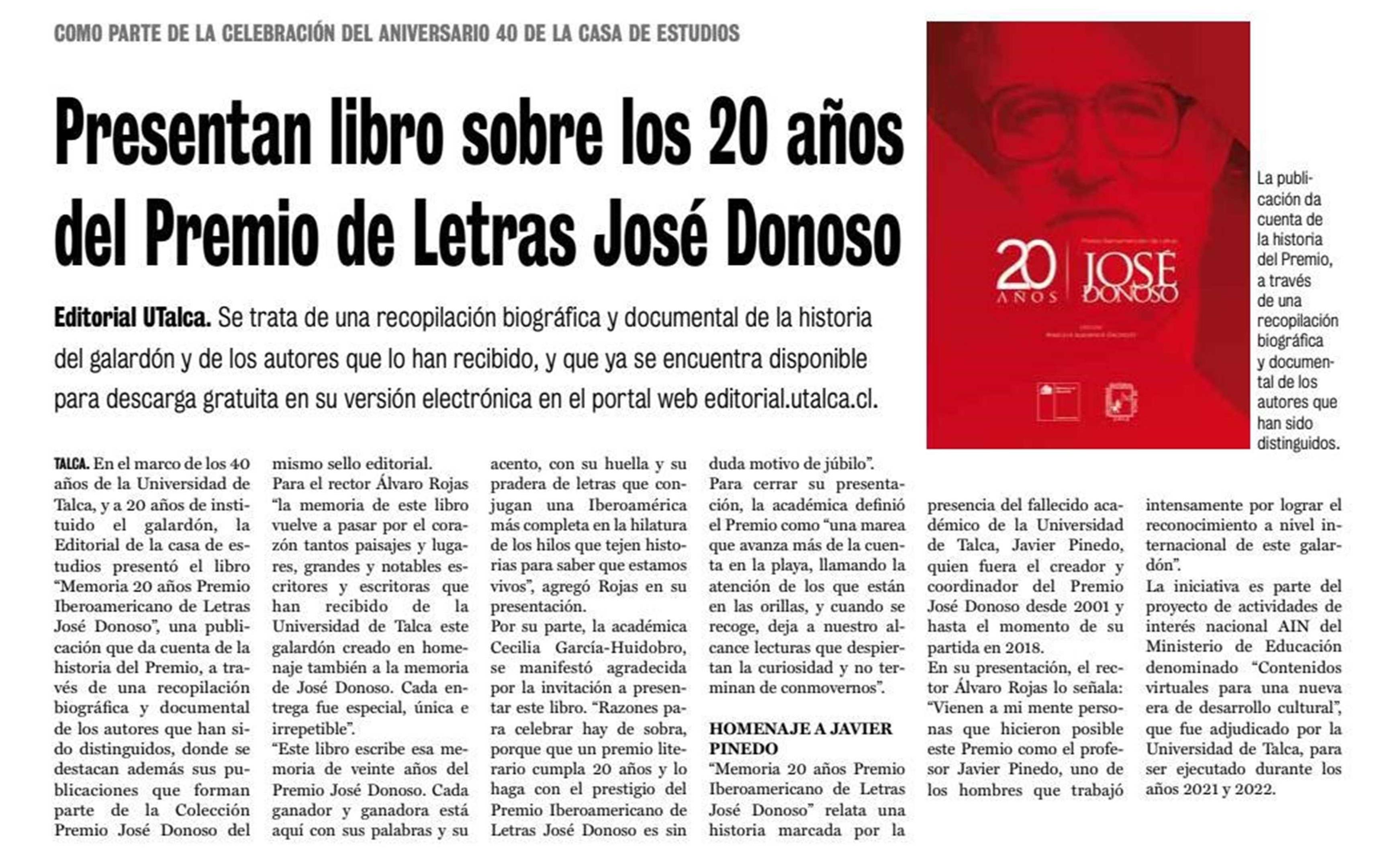 Presentan libro sobre los 20 años del Premio de Letras José Donoso.