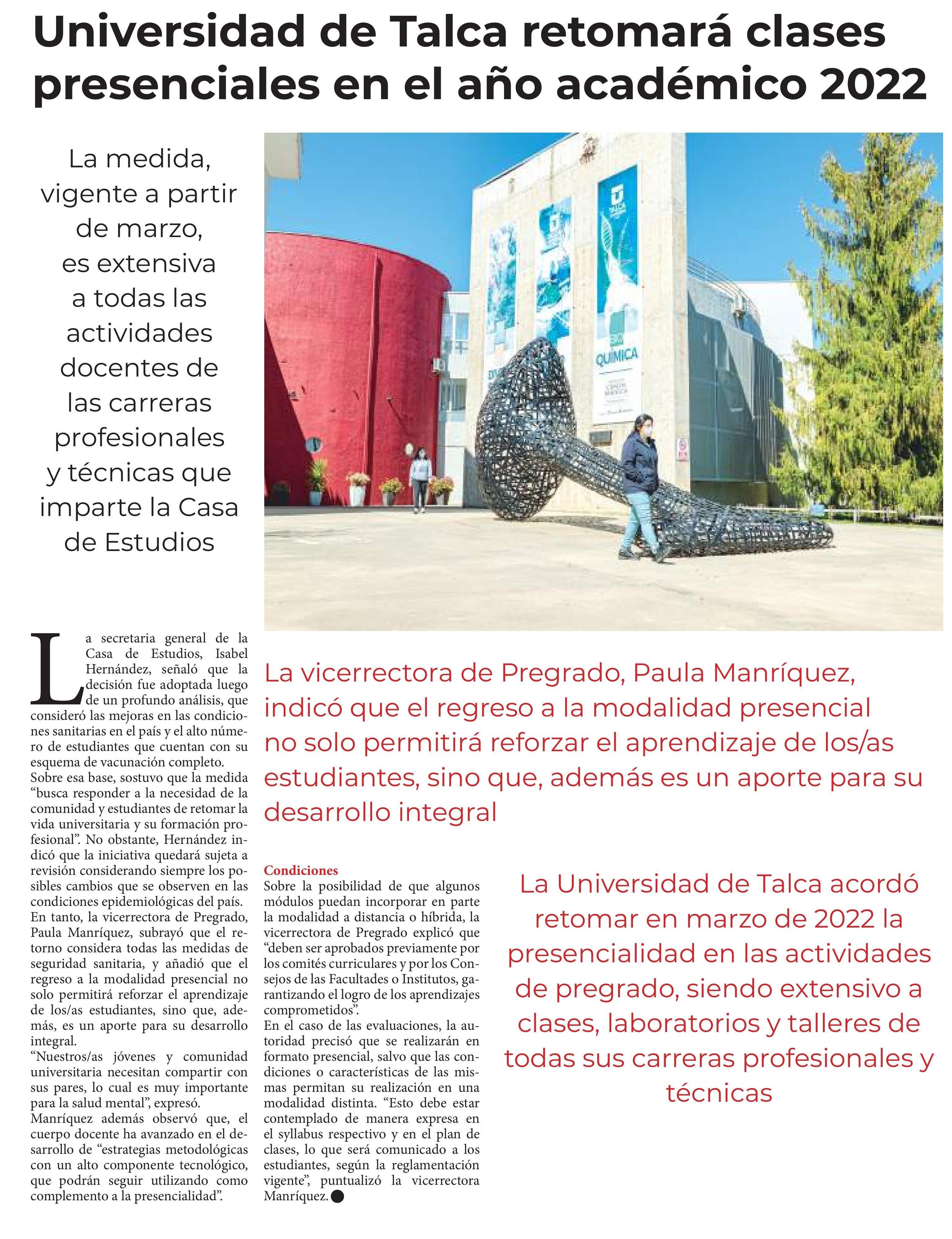Universidad de Talca anuncia el retorno de las clases presenciales a partir del 2022.