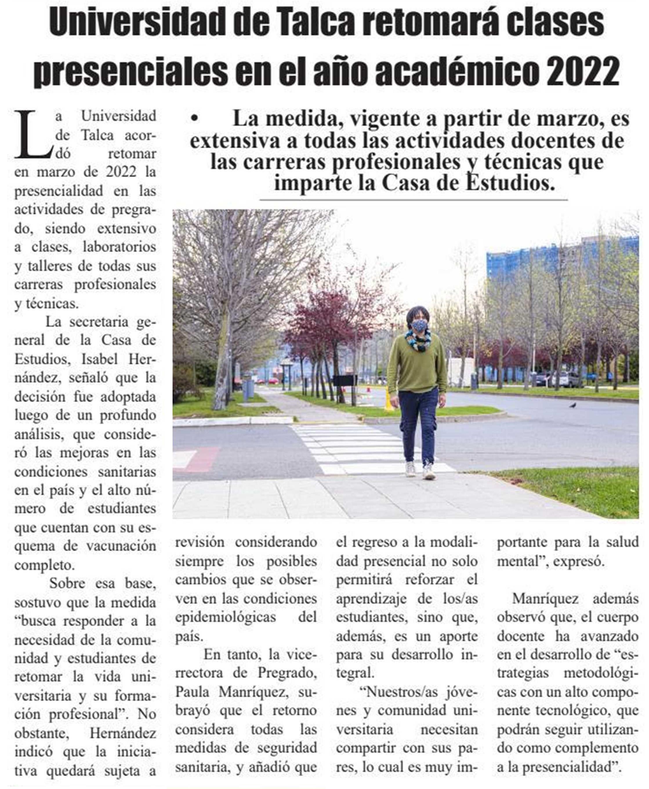 Portada: Universidad de Talca retomará clases presenciales en el año académico 2022.