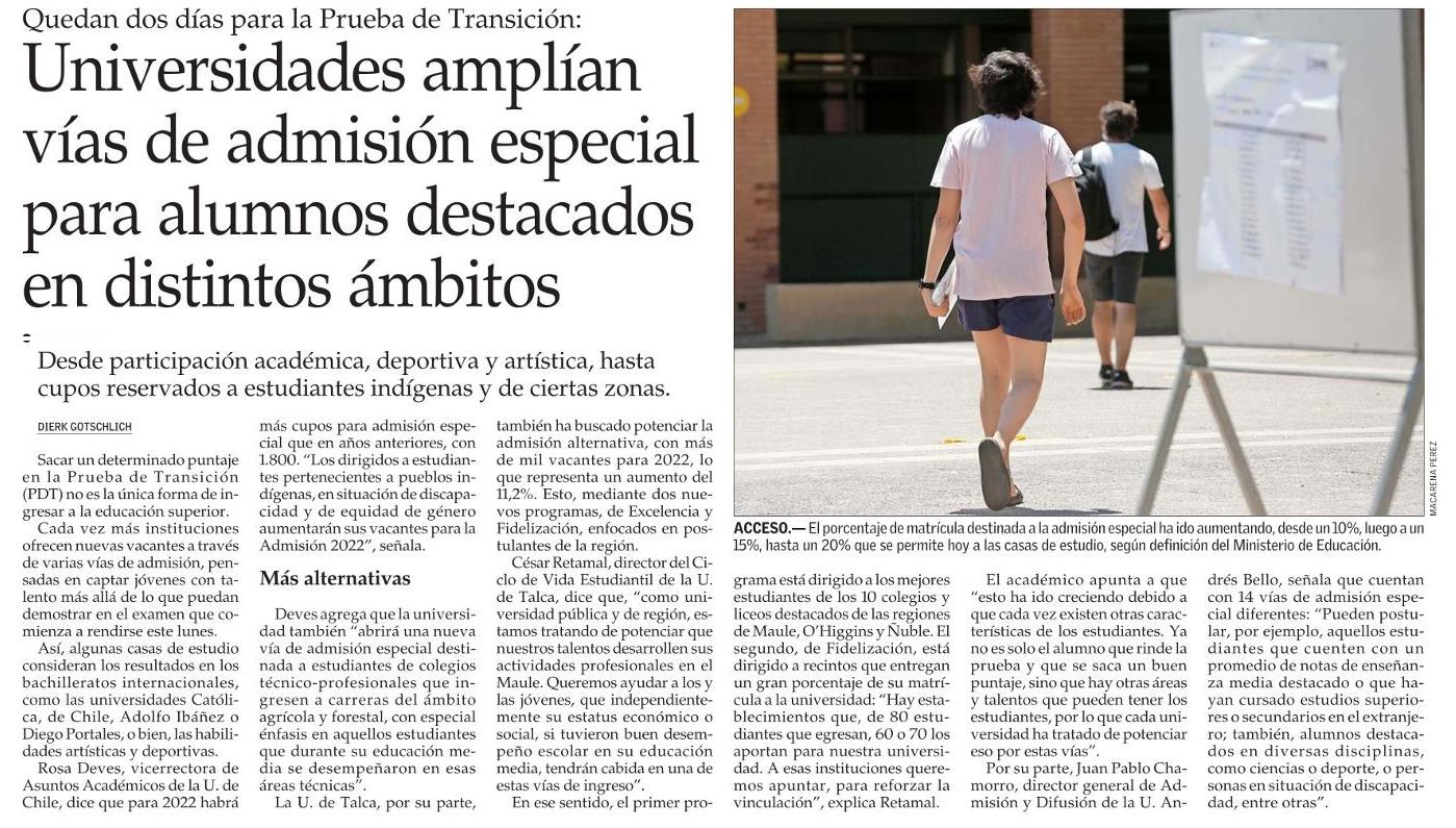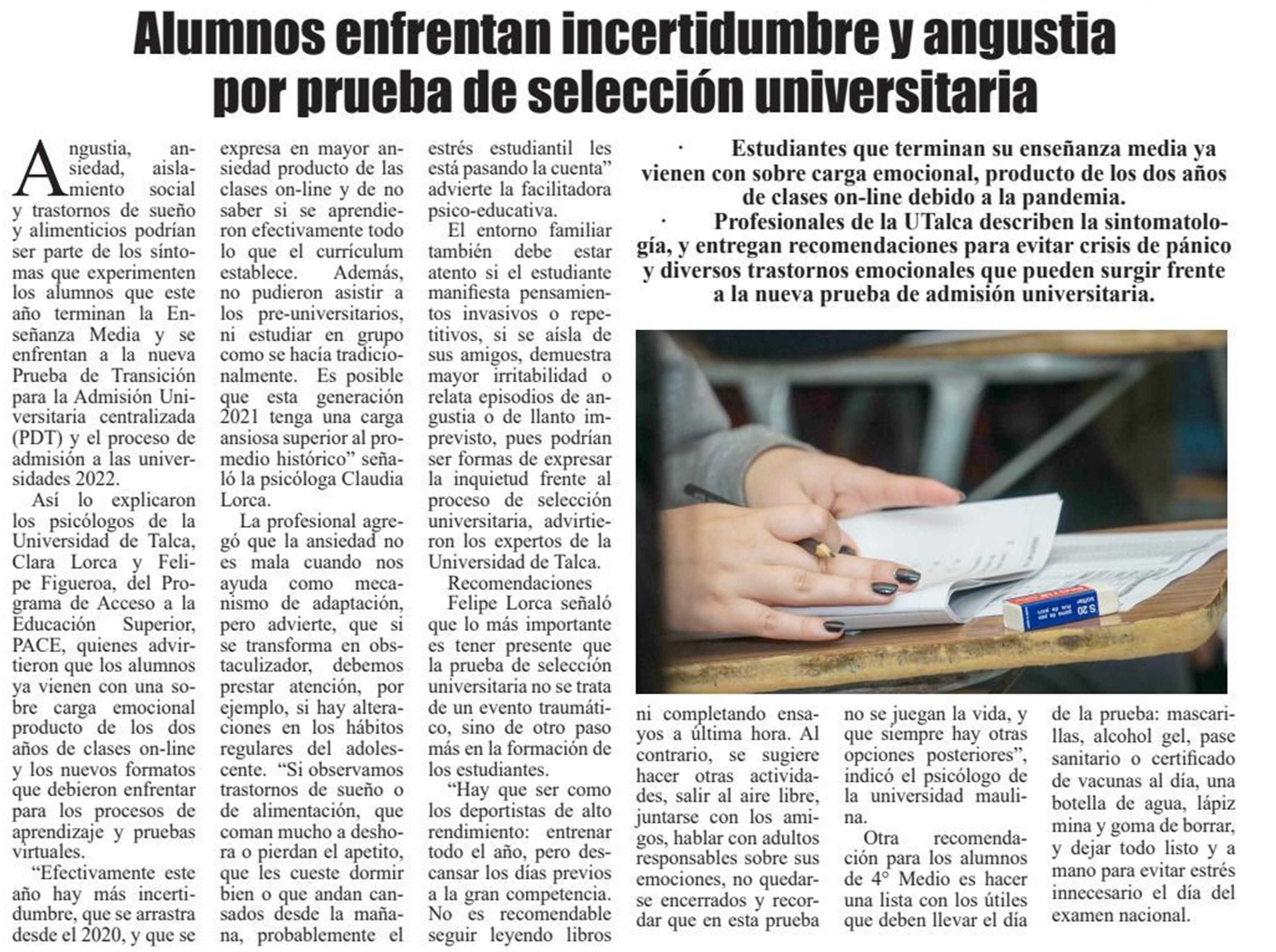 Este lunes comenzará la rendición de la Prueba de Transición Universitaria (PTU) para acceder a la educación superior. Se refieren Felipe Figueroa y Clara Lorca, profesionales del PACE UTalca.