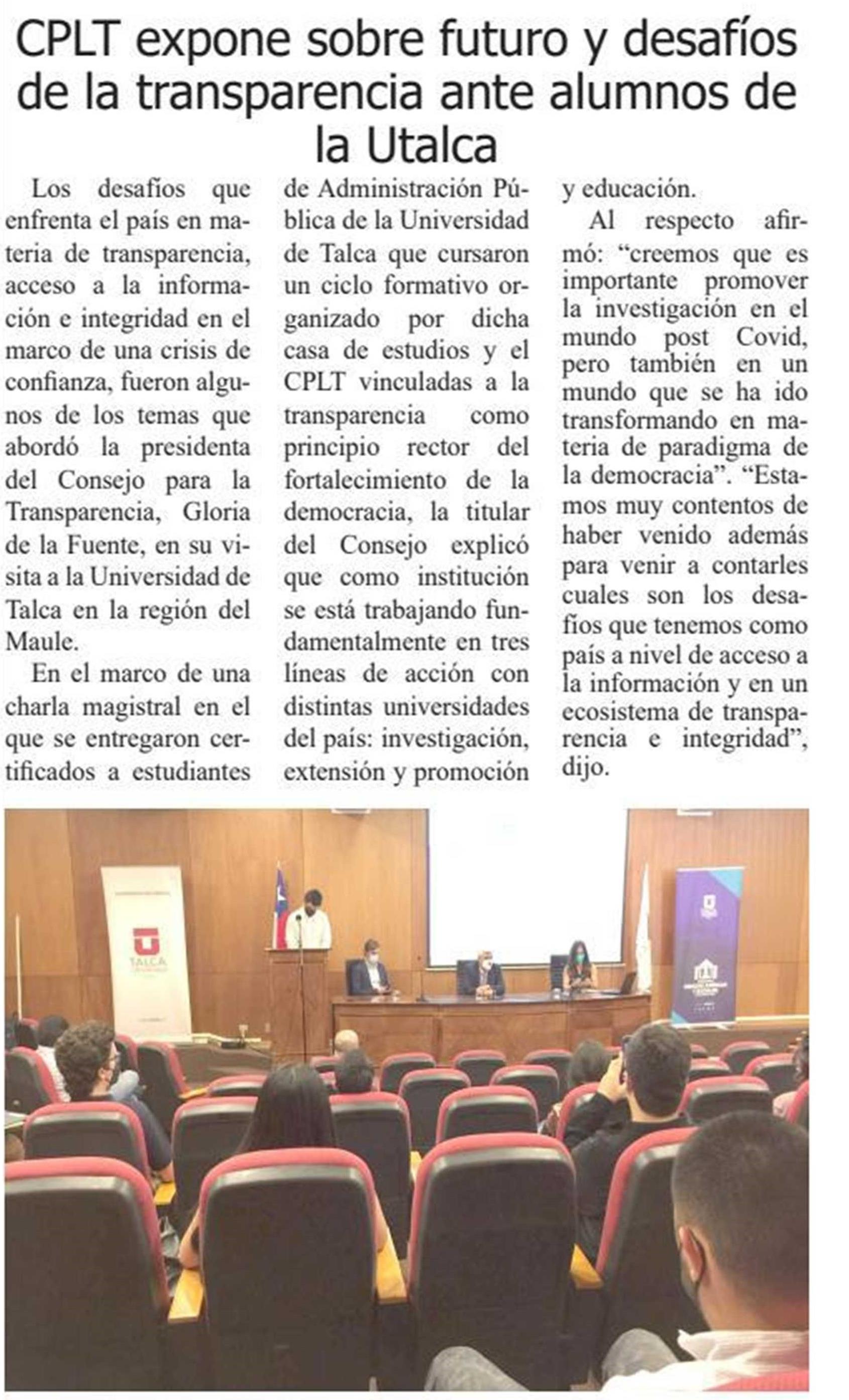 CPLT expone sobre futuro y desafíos de la transparencia ante alumnos de la UTalca.