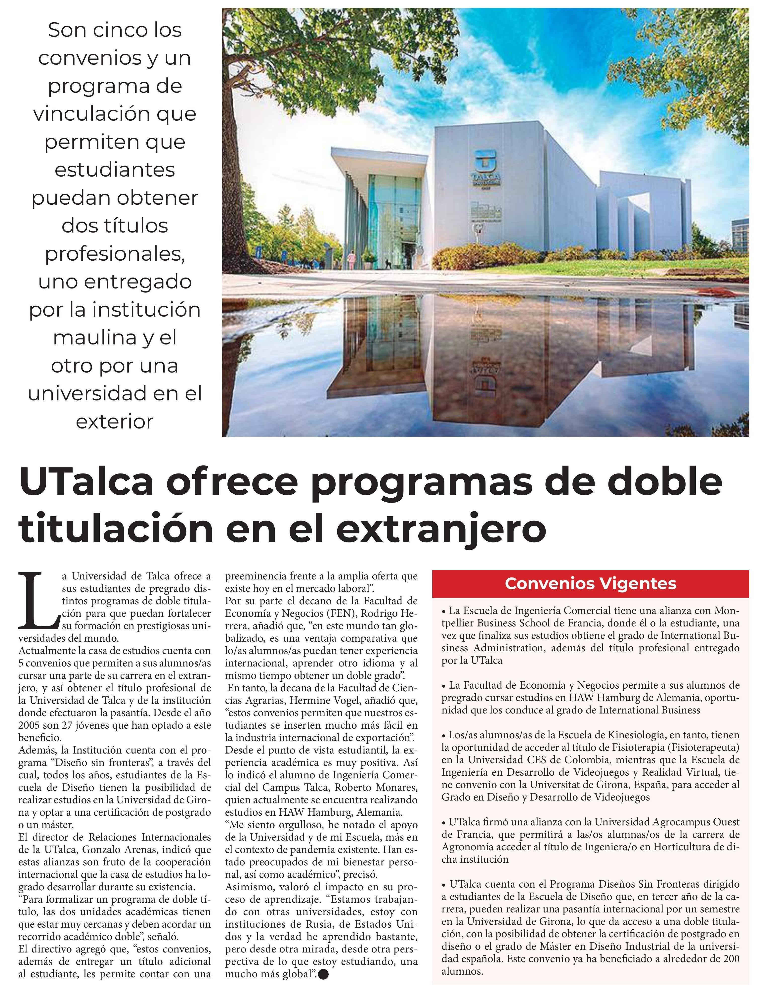 UTalca ofrece programas de doble titulación en el extranjero.