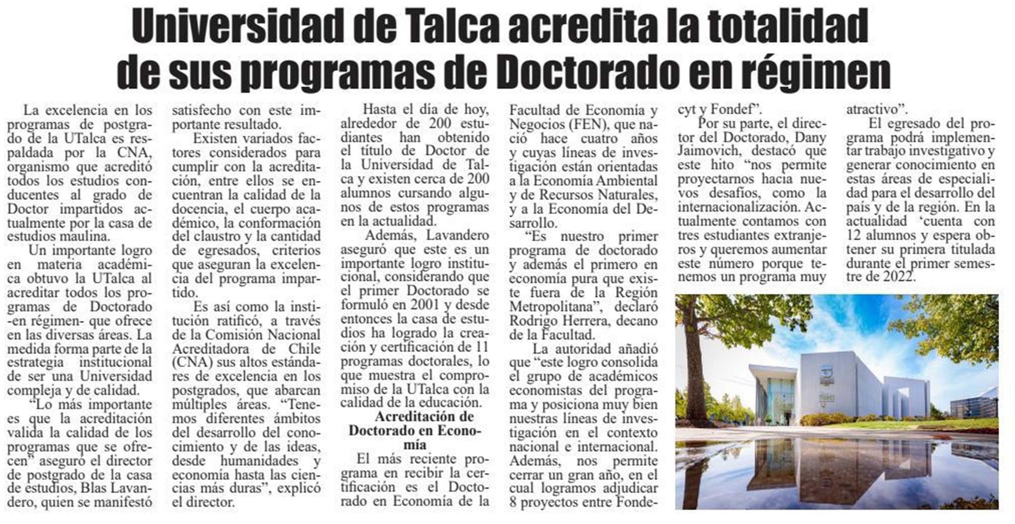 UTalca acredita programas de Doctorado.